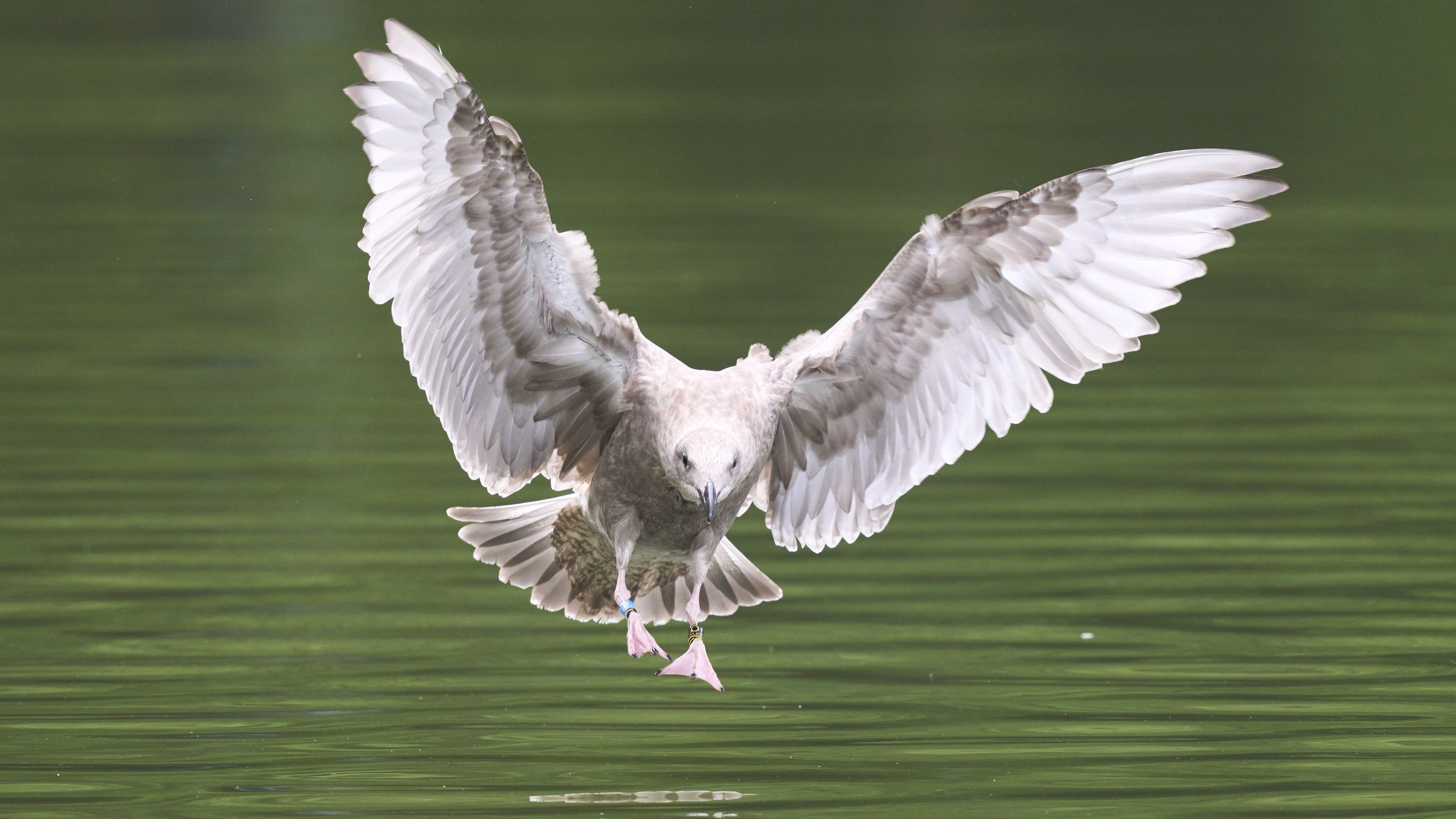 札幌市中島公園の菖蒲池にオオセグロカモメの幼鳥が着水する瞬間を捉えました。