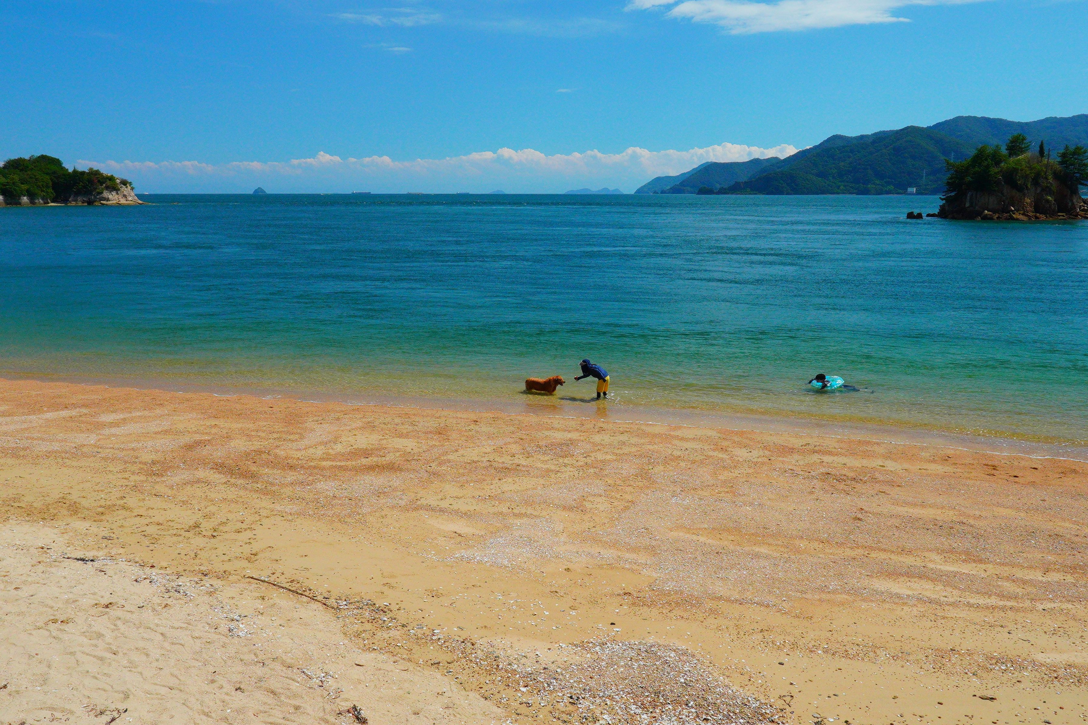 9月7日向島の海岸でラブラドールと少女が海水浴。美しい海をこの家族が独占して夏の終わりを満喫してました。。