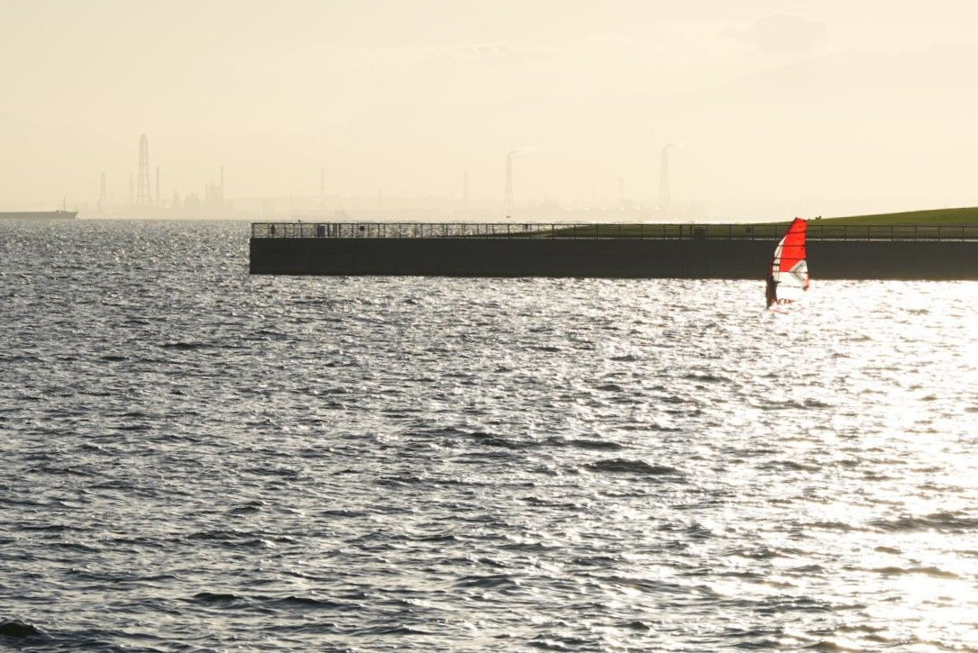 暦では秋だけど、まだまだ暑い日の夕方。 ウィンドサーフィンが気持ちよさそうに波の上を滑るように進んでました。 遠くに四日市の工場地帯のシルエットを望んで。