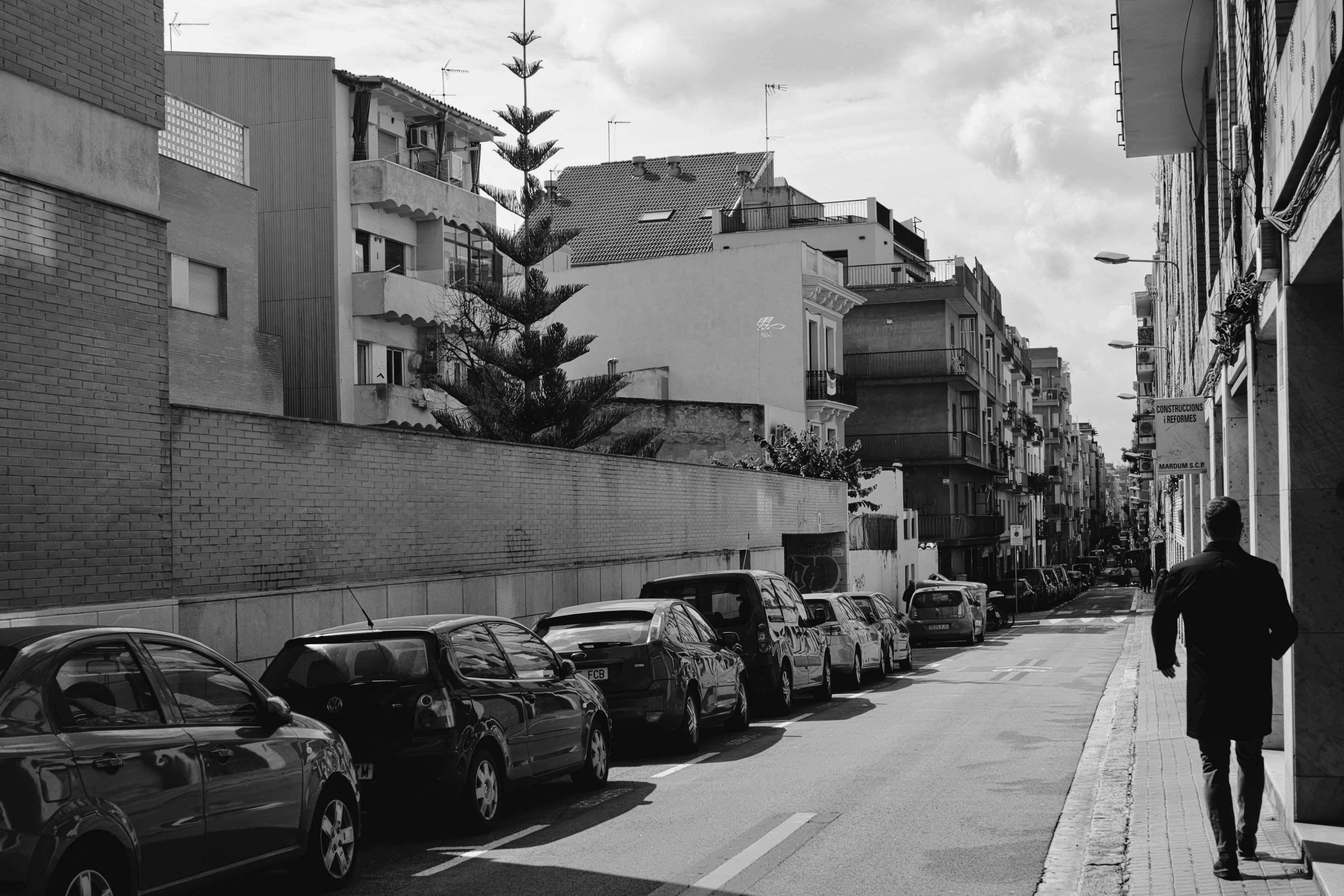 バルセロナのグエル公園から歩いて20分ほどの路地で撮った一枚です。 写真右奥の消失点に向けて建物や車が伸びていく様子や、木と男性の対比が心地良いと感じます。 3月中旬の天気に恵まれたバルセロナは最高でした。 #スペイン# #バルセロナ#