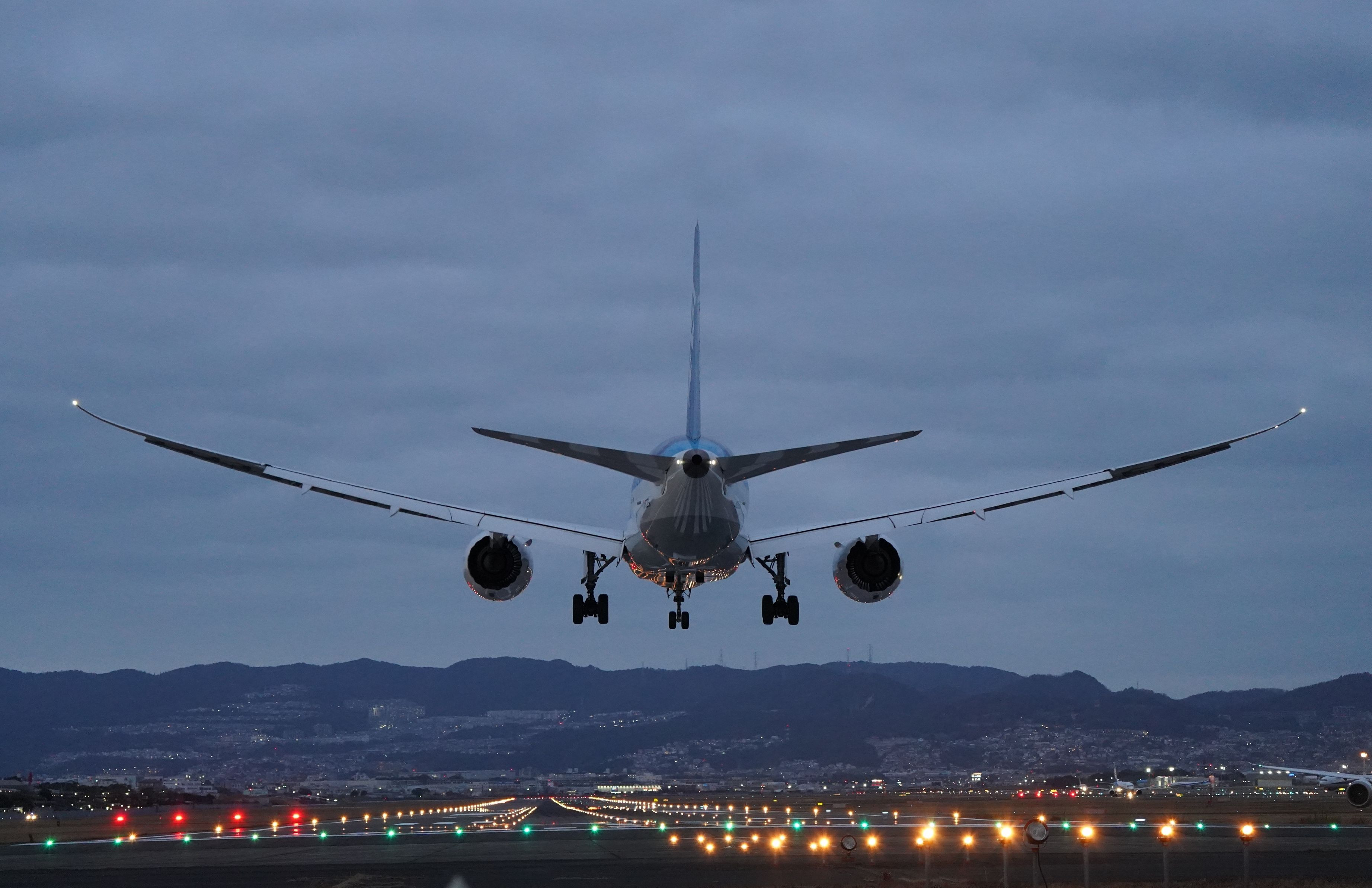 夕暮れ時、空港の明かりが飛行機のボディに反射してキレイでした☆