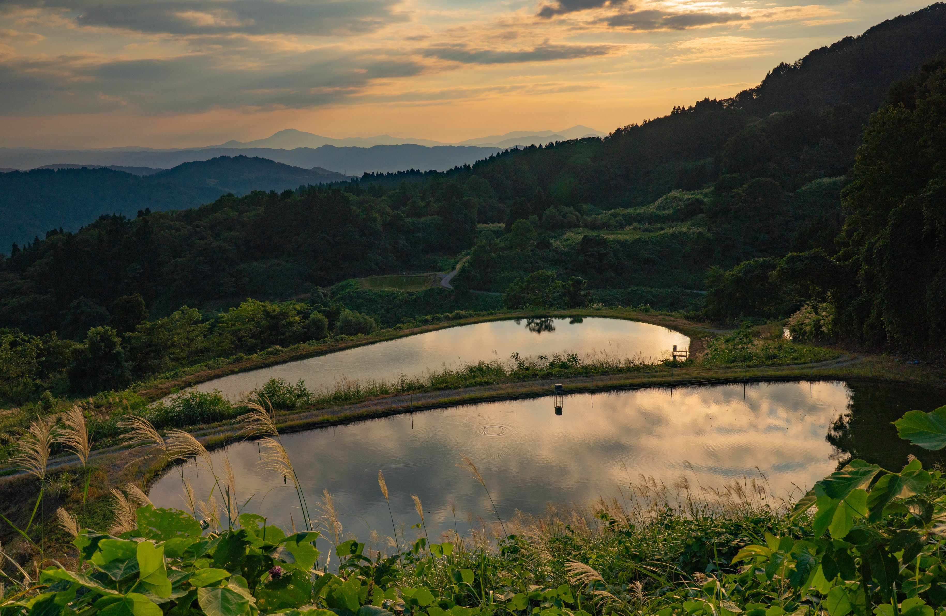 まだ暑さの強く残る9月上旬、夕暮れ時の棚池を撮影しました ススキの穂が出始め、終わらない夏と秋の始まりが交錯していました。
