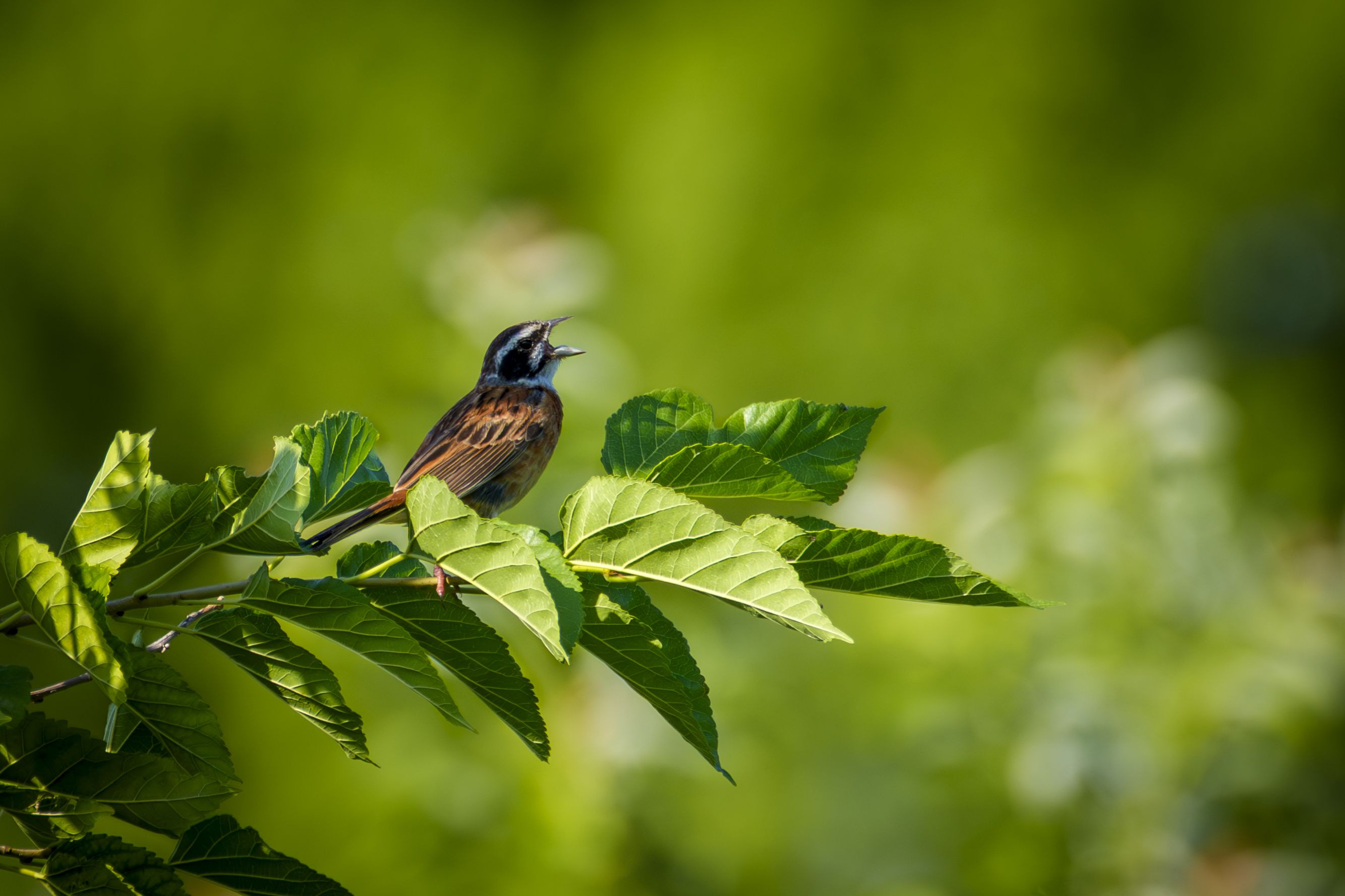8月の暑い夕暮れ時に #ホオジロ# が元気に鳴いていました。 こちらは直射で汗だくでしたが鳴いているホオジロはちょっと木陰で涼しそう。 夏の撮影は緑が綺麗ですね~w