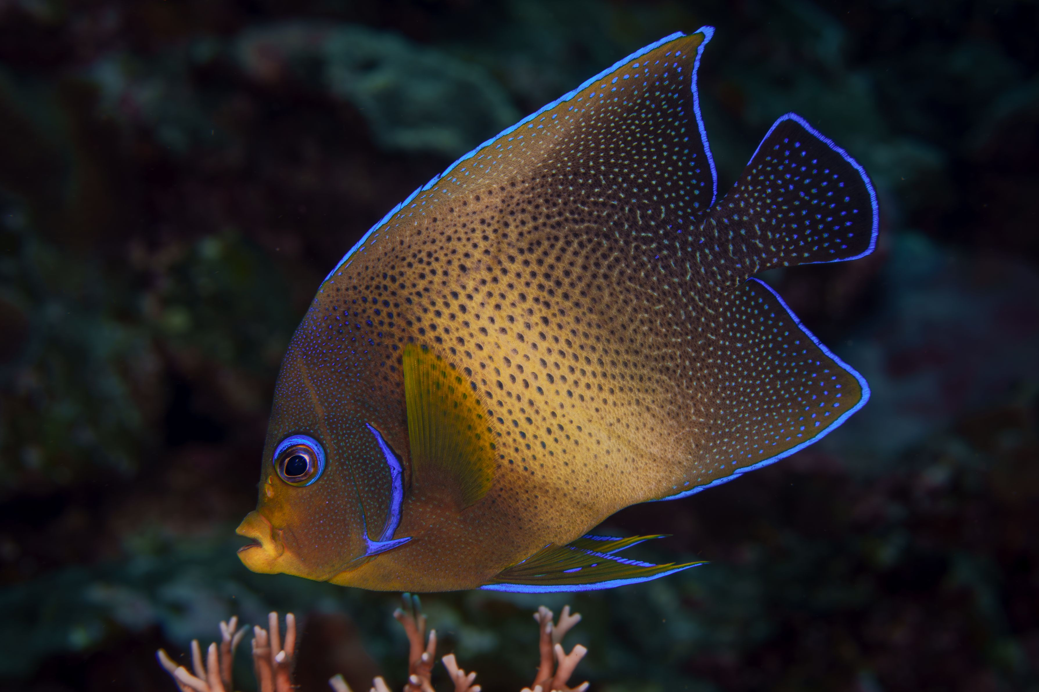 ネオンの縁取りが美しい グルグル模様が美しい幼魚と全く違う キンチャクダイ系は臆病で常にひらひら動いてるので図鑑写真を撮ることは難しい種 自身初めて撮影に成功しました