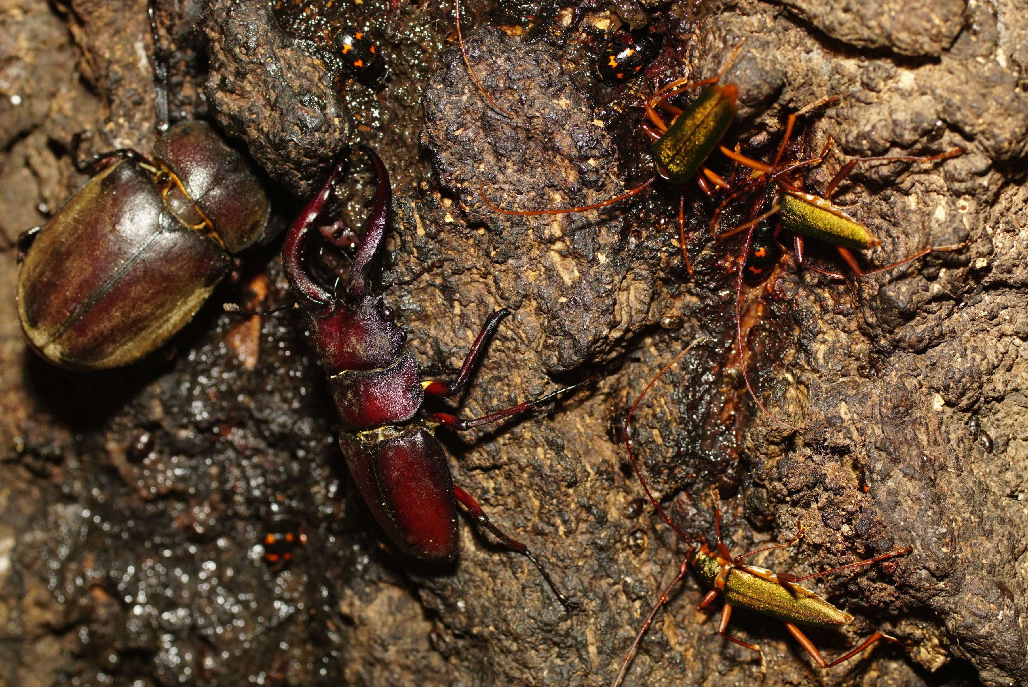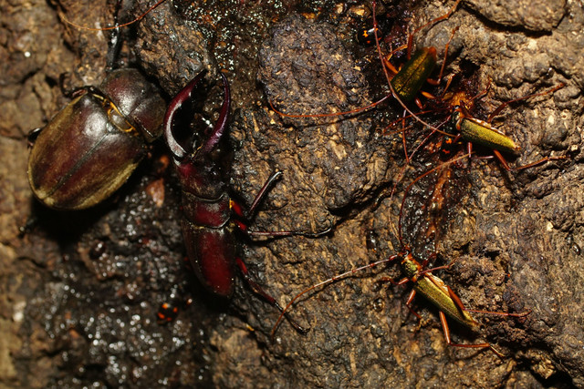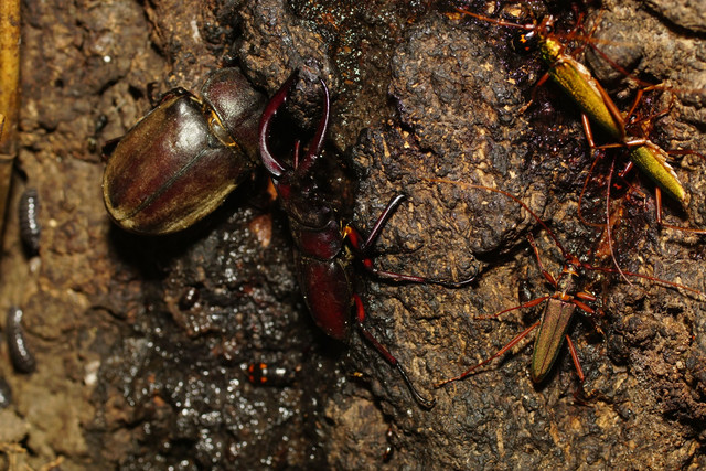 いよいよ夏も終盤となった撮影日。右前足が欠損したノコギリクワガタ大歯形♂が、カブトムシの♀と距離を保ちながら一杯やっていました。