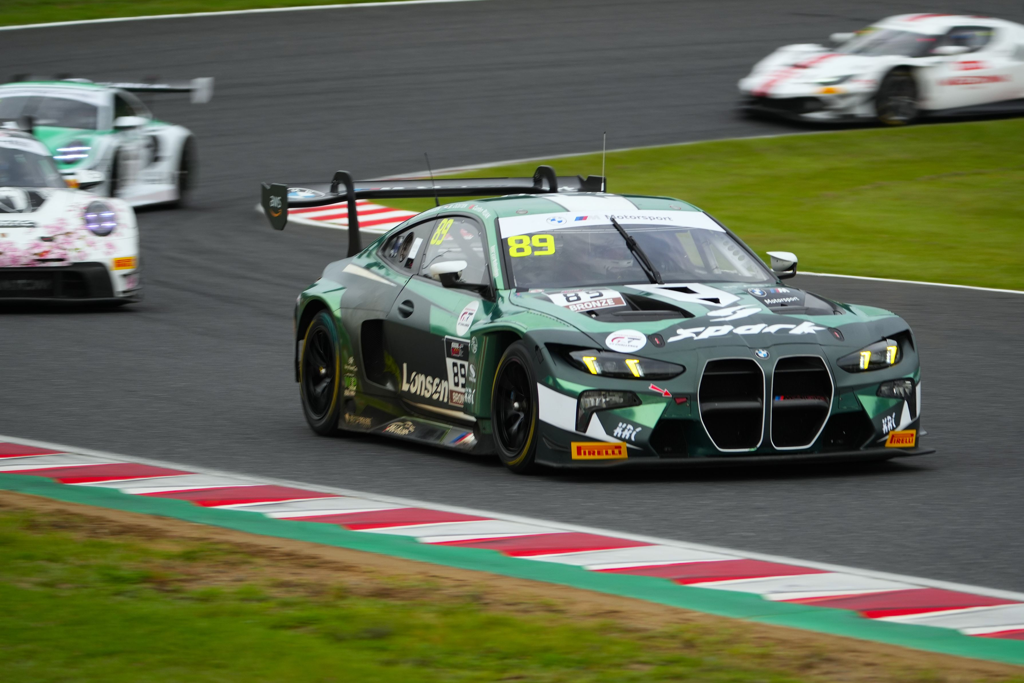 ヘアピンを立ち上がるBMW M4GT3を流し撮りで。追走するマシンがレースの臨場感を出しています。