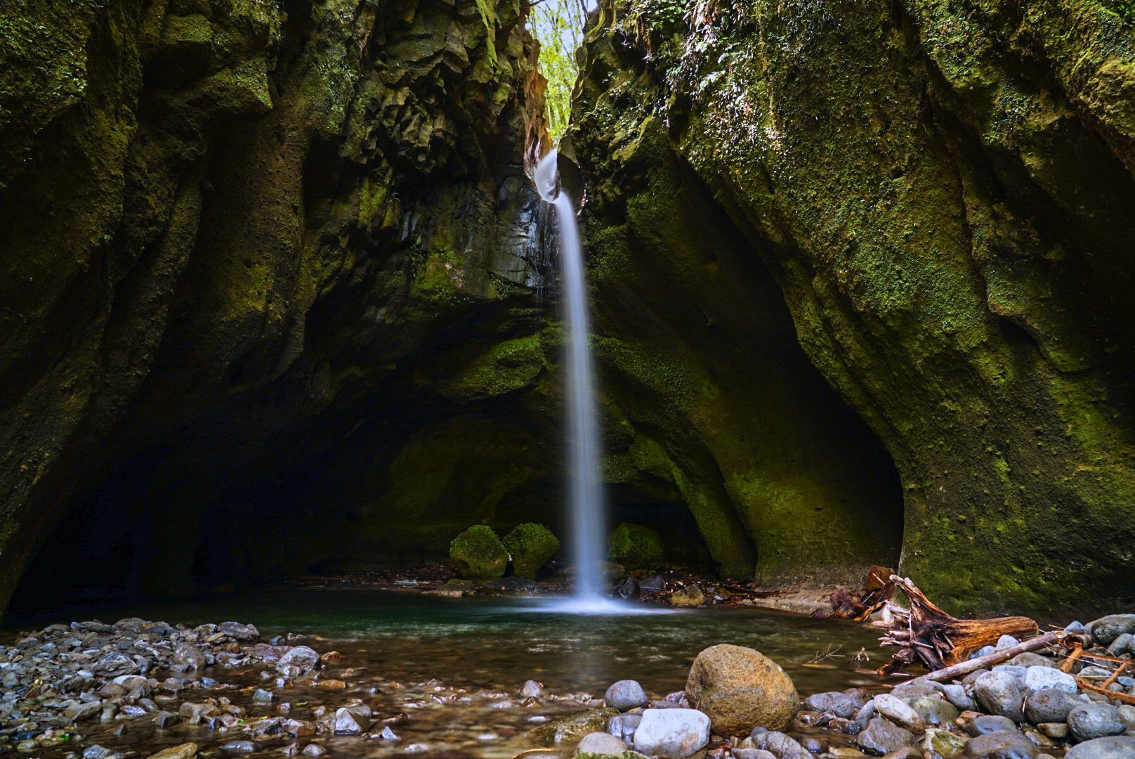 洞穴の前に立ちはだかる滝。苔むしたドーム型の岩肌がなんとも美しかった。「長野滝」別名「裏見の滝」と呼ばれるように滝の表と裏から見ることができます。