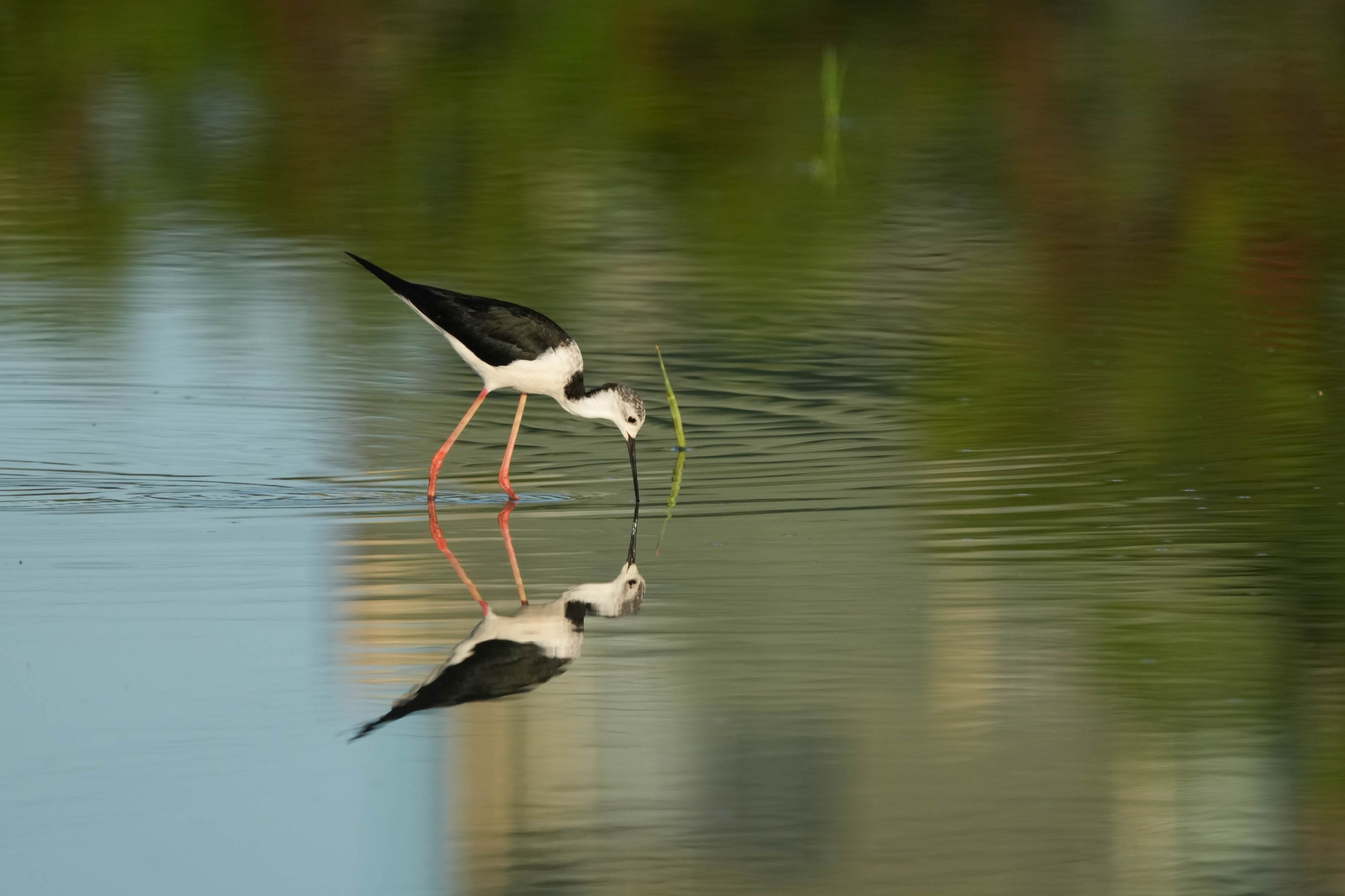 田んぼの開けた水面で餌を探すセイタカシギ