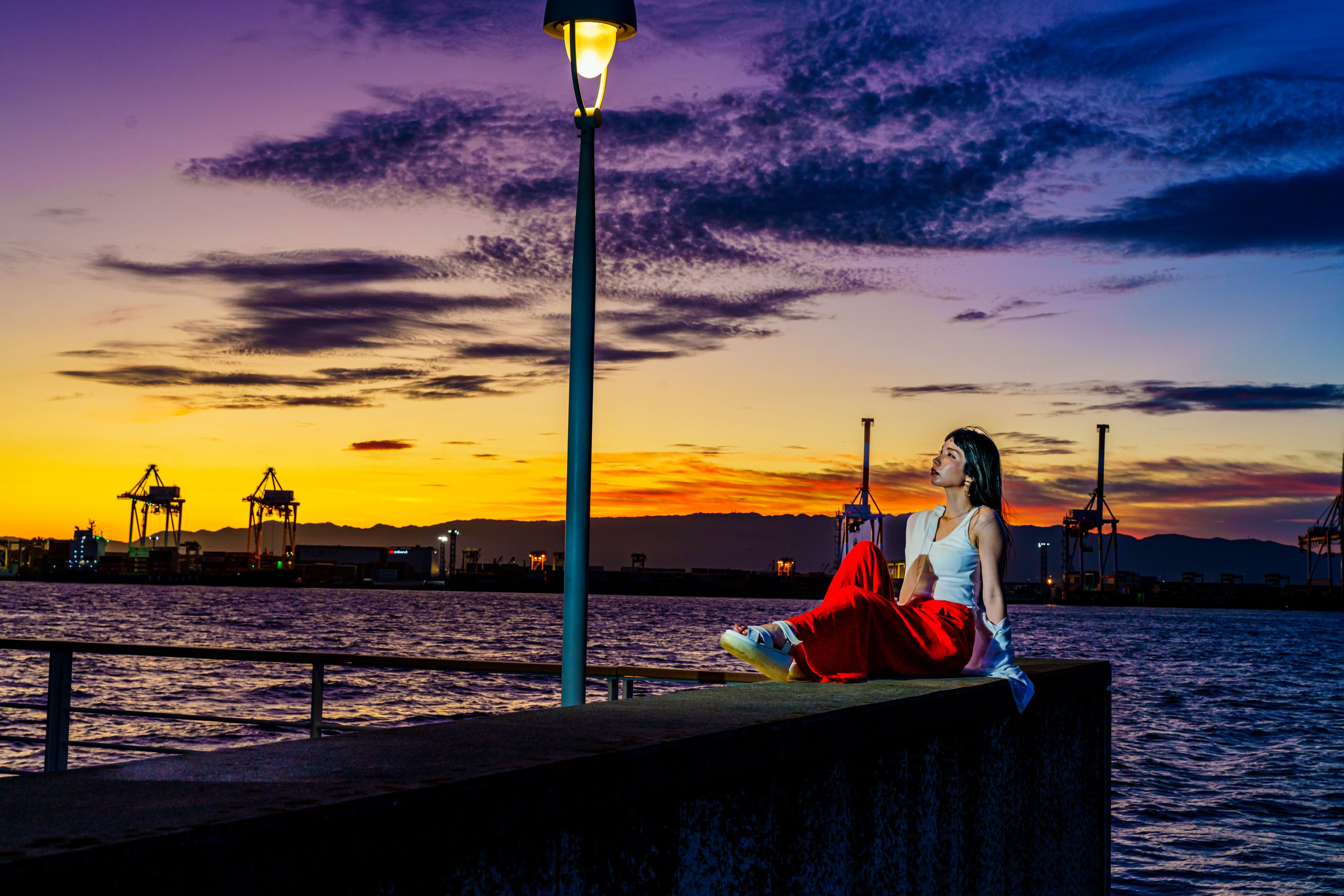 7月の夕焼けです。 万博会場の対岸で、コンテナヤードのクレーンがキリンのように並んでいました