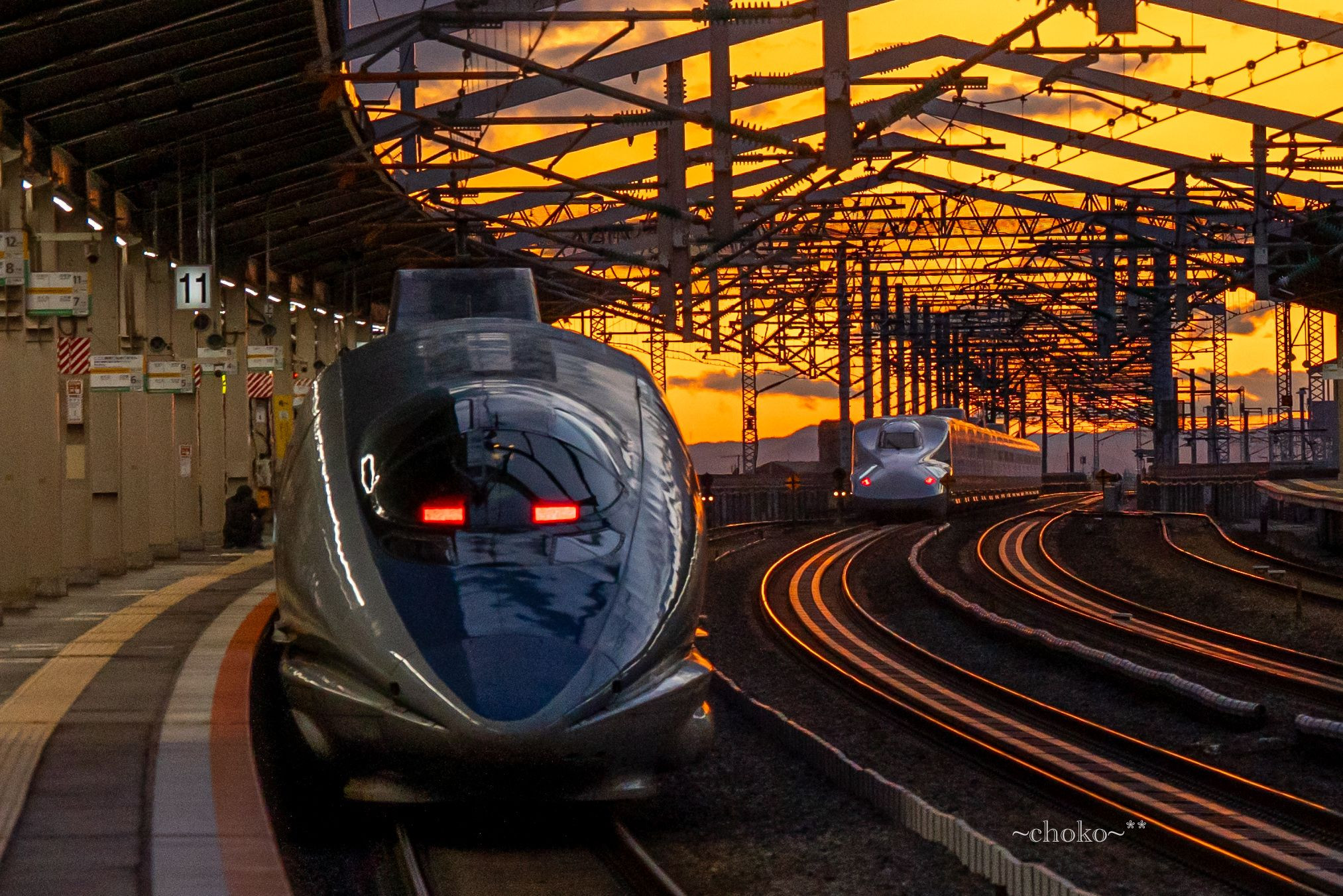 夕日と新幹線