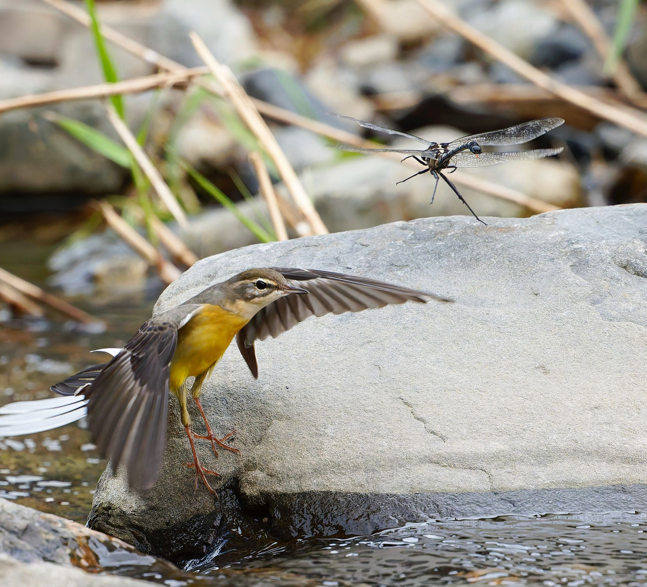 舞い降りたキセキレイに驚いて、コオニヤンマが飛び立った瞬間です😂
