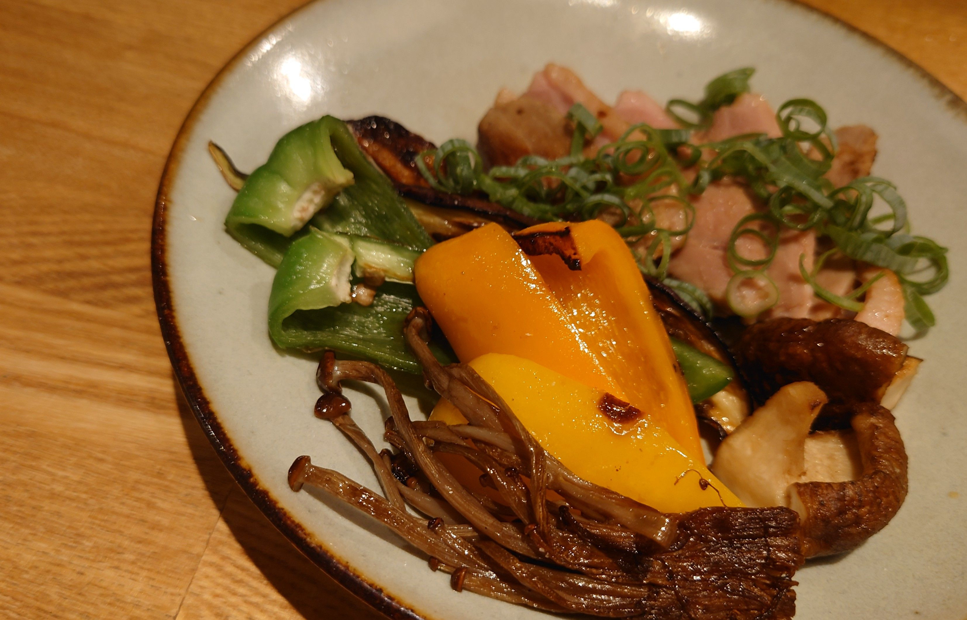 合鴨のローストに、ピーマン、椎茸、パプリカ、ブラウンエノキを焼いたものを添えた美味しい料理です🙂