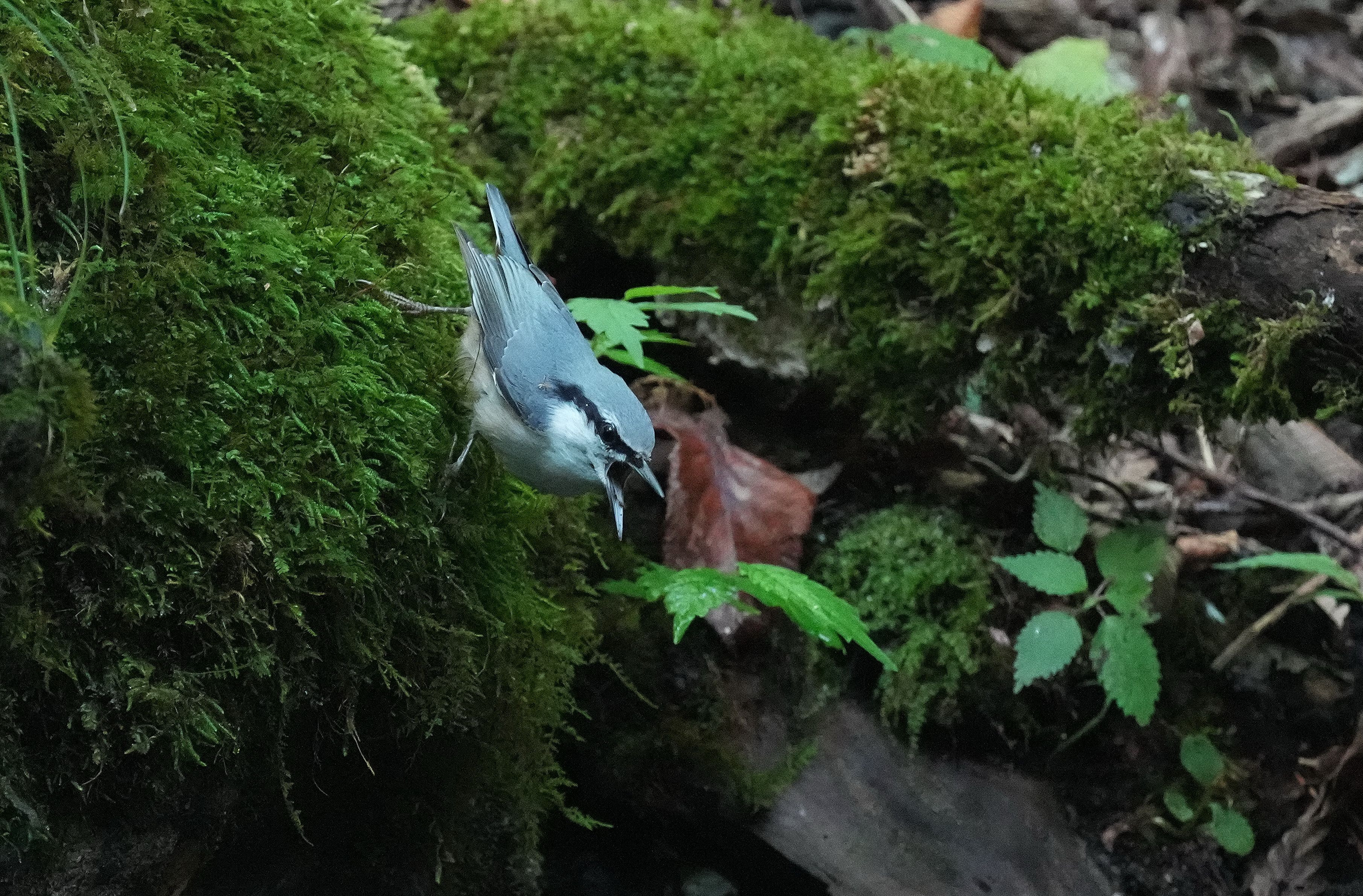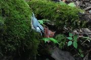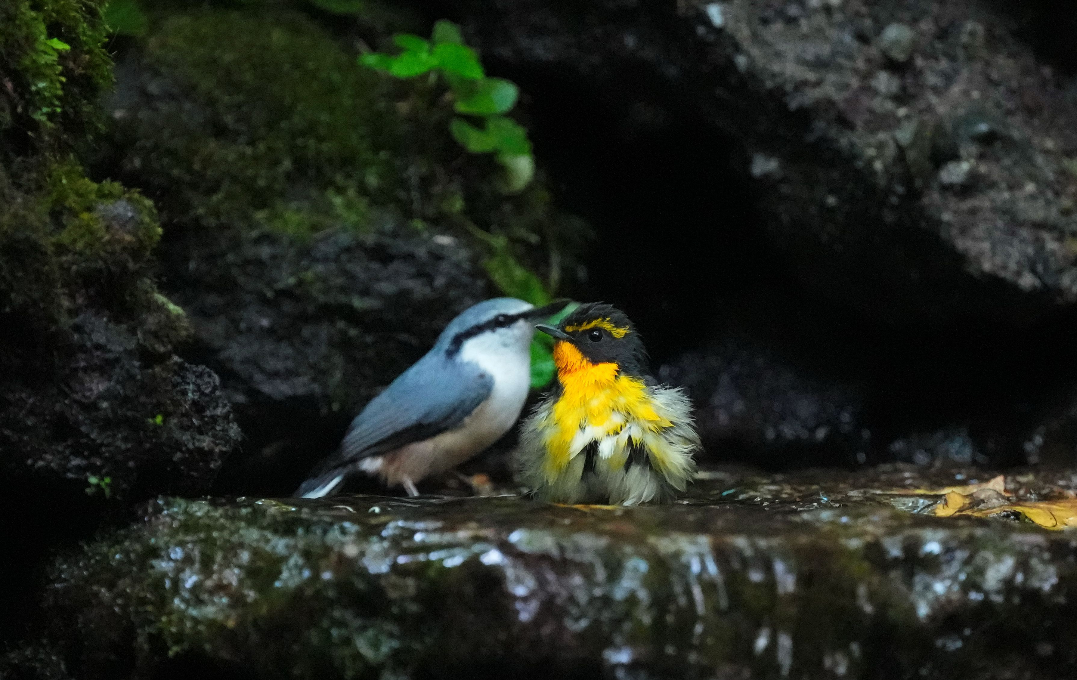 水場に降りたいゴジュウカラ、先客が居て口を尖らせましたが、仲良く水浴び。