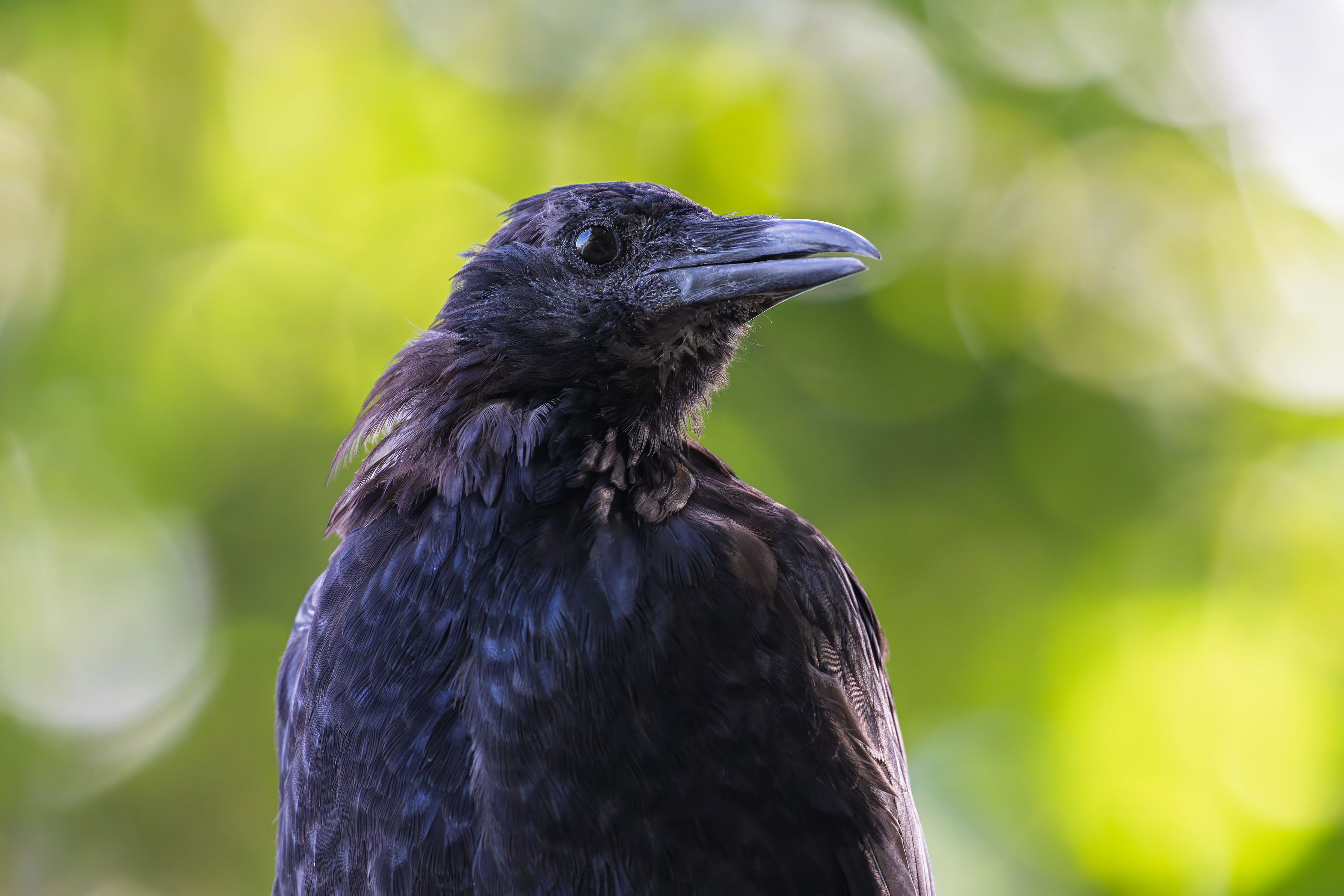 静かにとまるカラスが、柔らかな木漏れ日に包まれていました。 羽に浮かぶ青紫の光沢がとてもきれいで、しばらく見とれてしまった一瞬です。