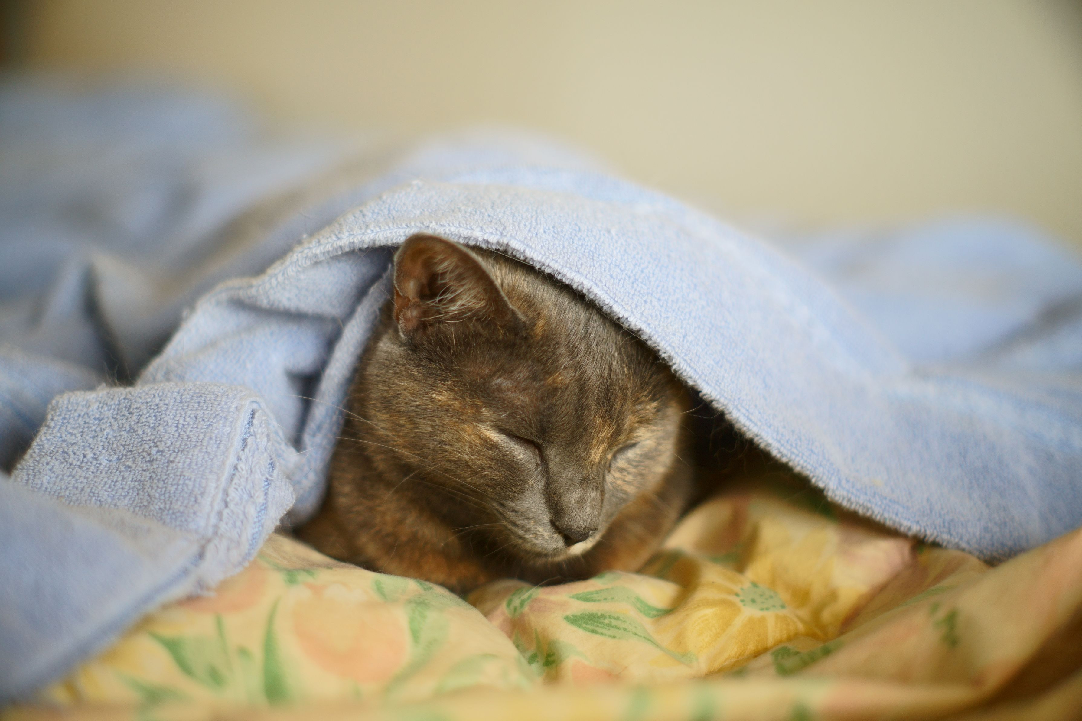 ここ数日すっかり秋の空気に入れ替わり自らタオルケットに潜り込むようになった妹ネコ「はるか」。 いつも顔だけ出しているところがまたかわいい! *SuperTakumar 55mm