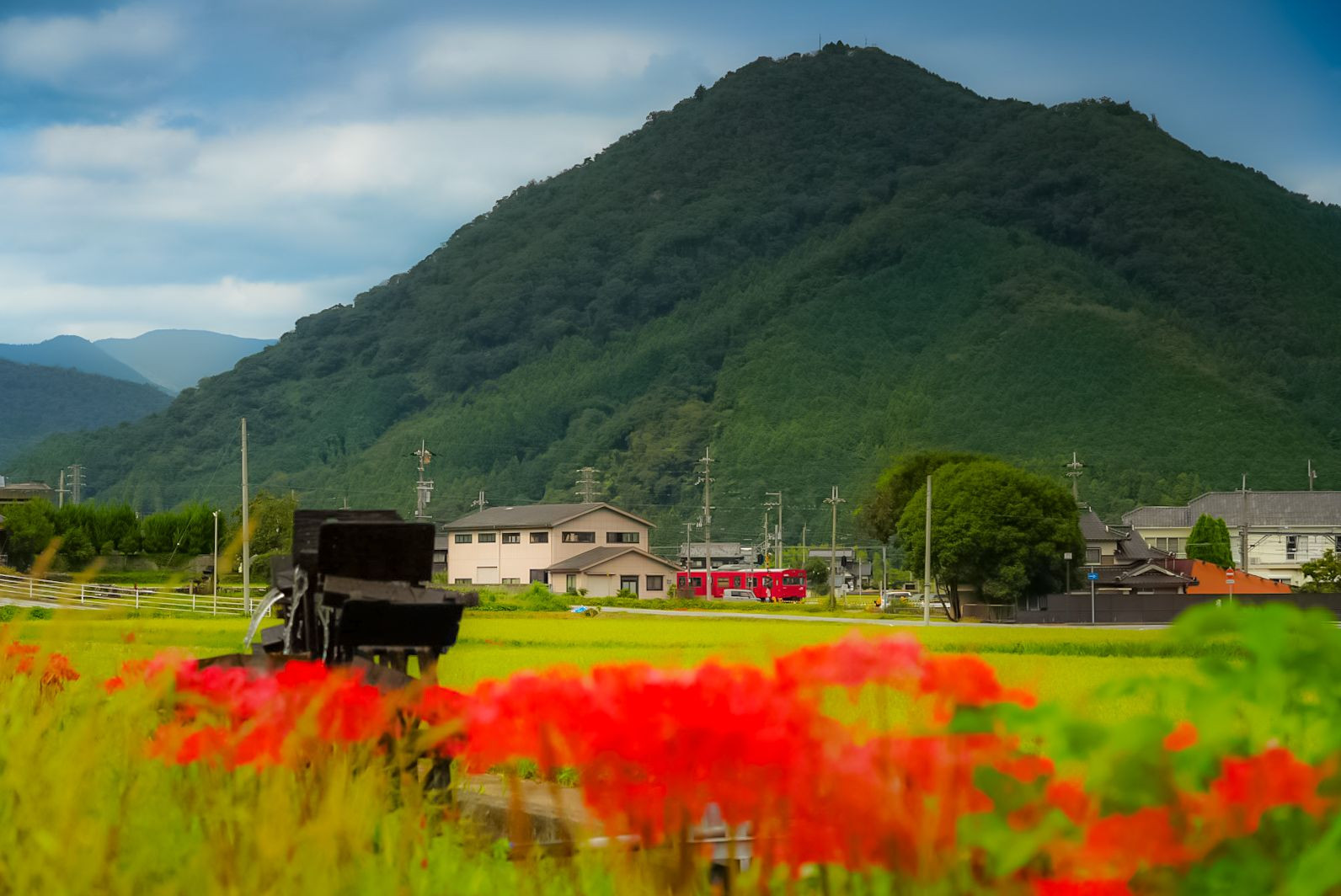 水車が回り 彼岸花が赤く揺れ 稲穂が黄金に色づく頃🌾 駅に滑り込む103系 まるで時が止まったような 懐かしき風景の中で――
