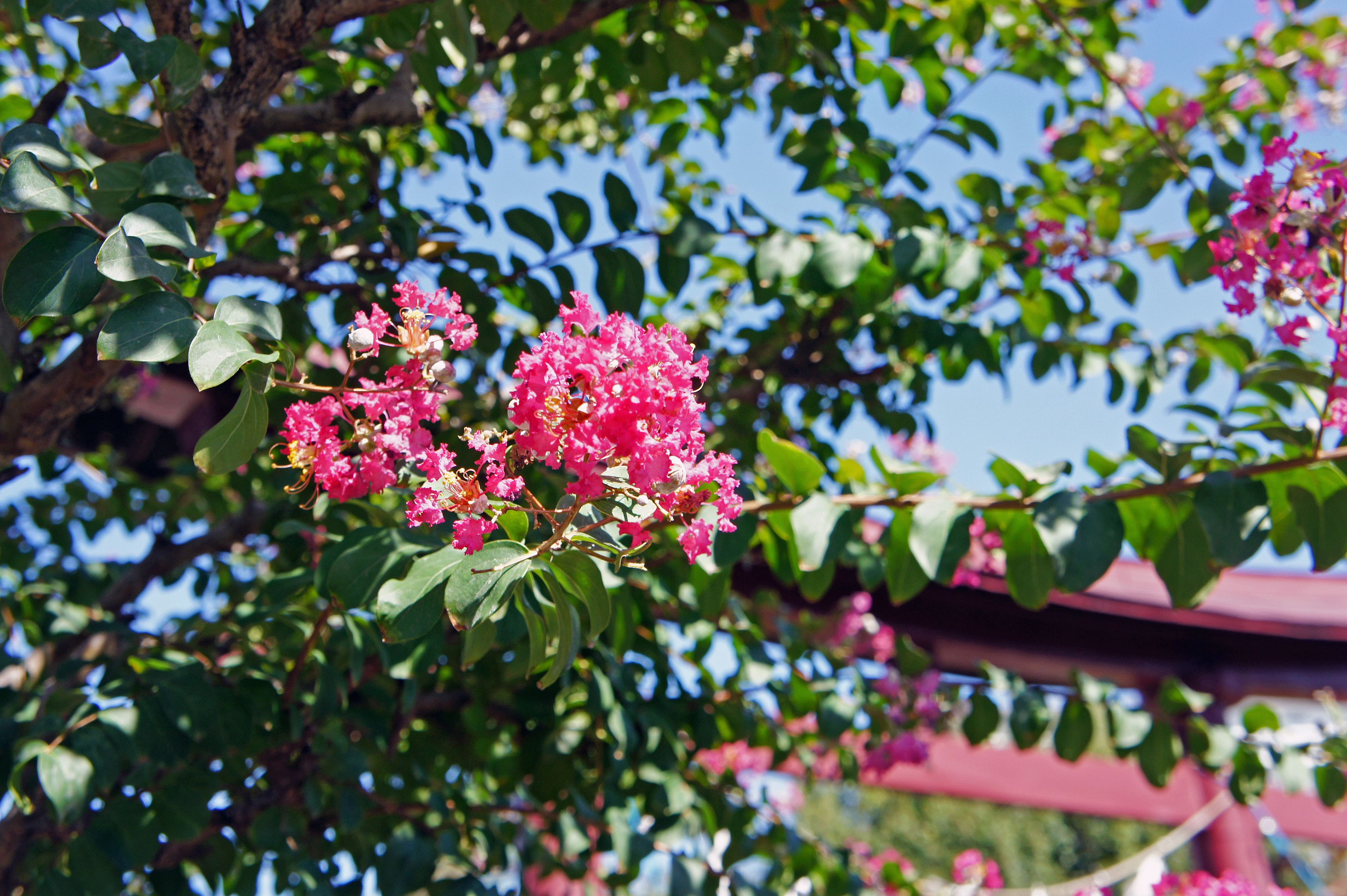 神社の赤い⛩️横に、赤い百日紅の花が美しく咲いていました。