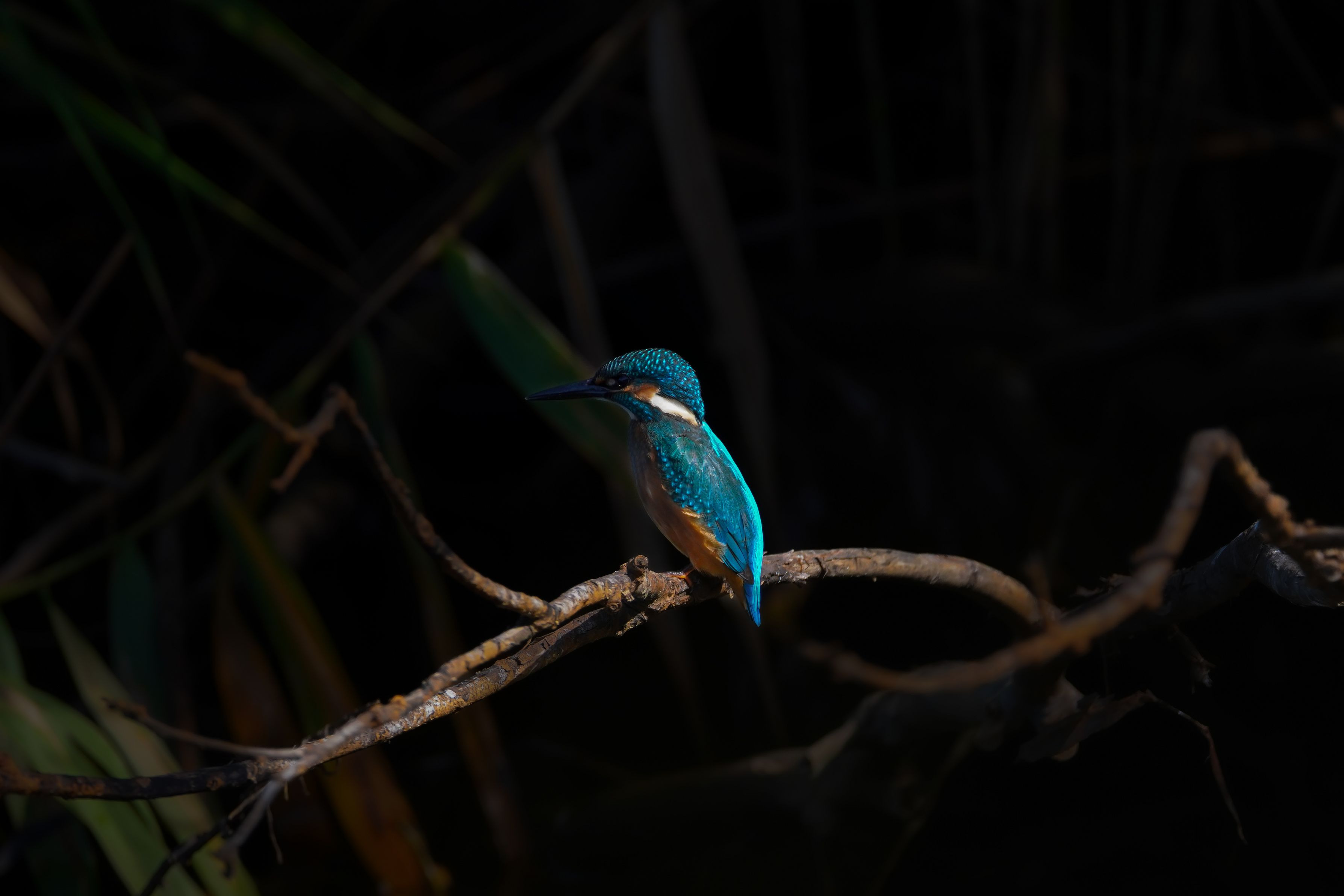 暗がりに止まるカワセミが柔らかな木漏れ日に照らされて綺麗でした^^