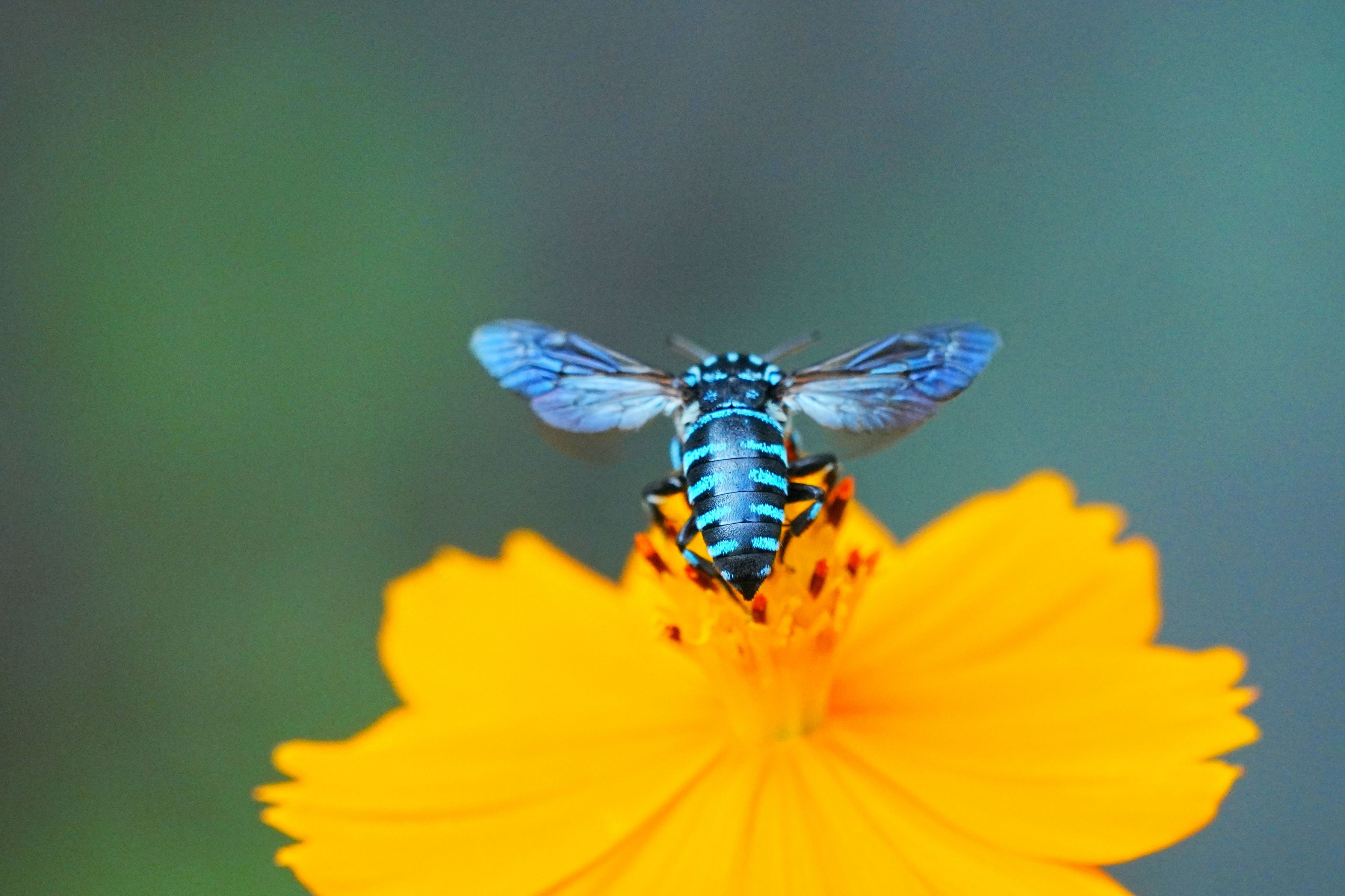 キバナコスモスにやって来たルリモンハナハチ