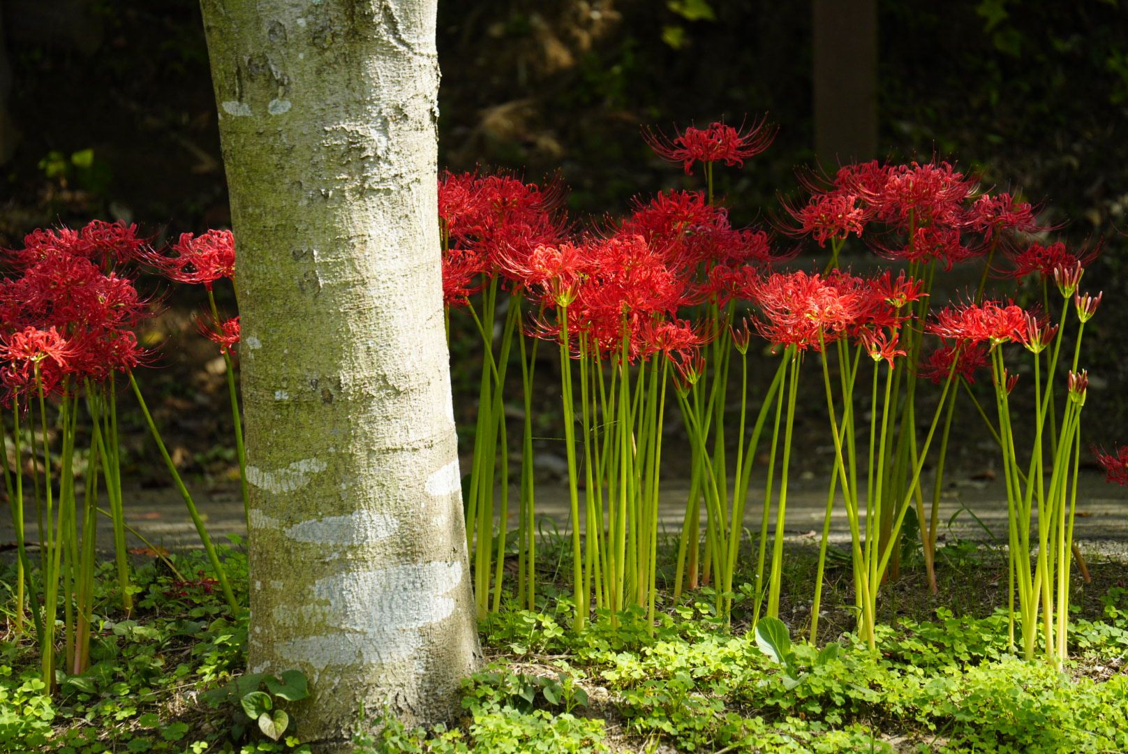 池のほとりに咲く彼岸花です。お彼岸限定の燃えるような紅い彼岸花が好きです。こちらの池では必ず毎年ちゃんと、お彼岸weekに咲くので、環境がいいのだと思います。