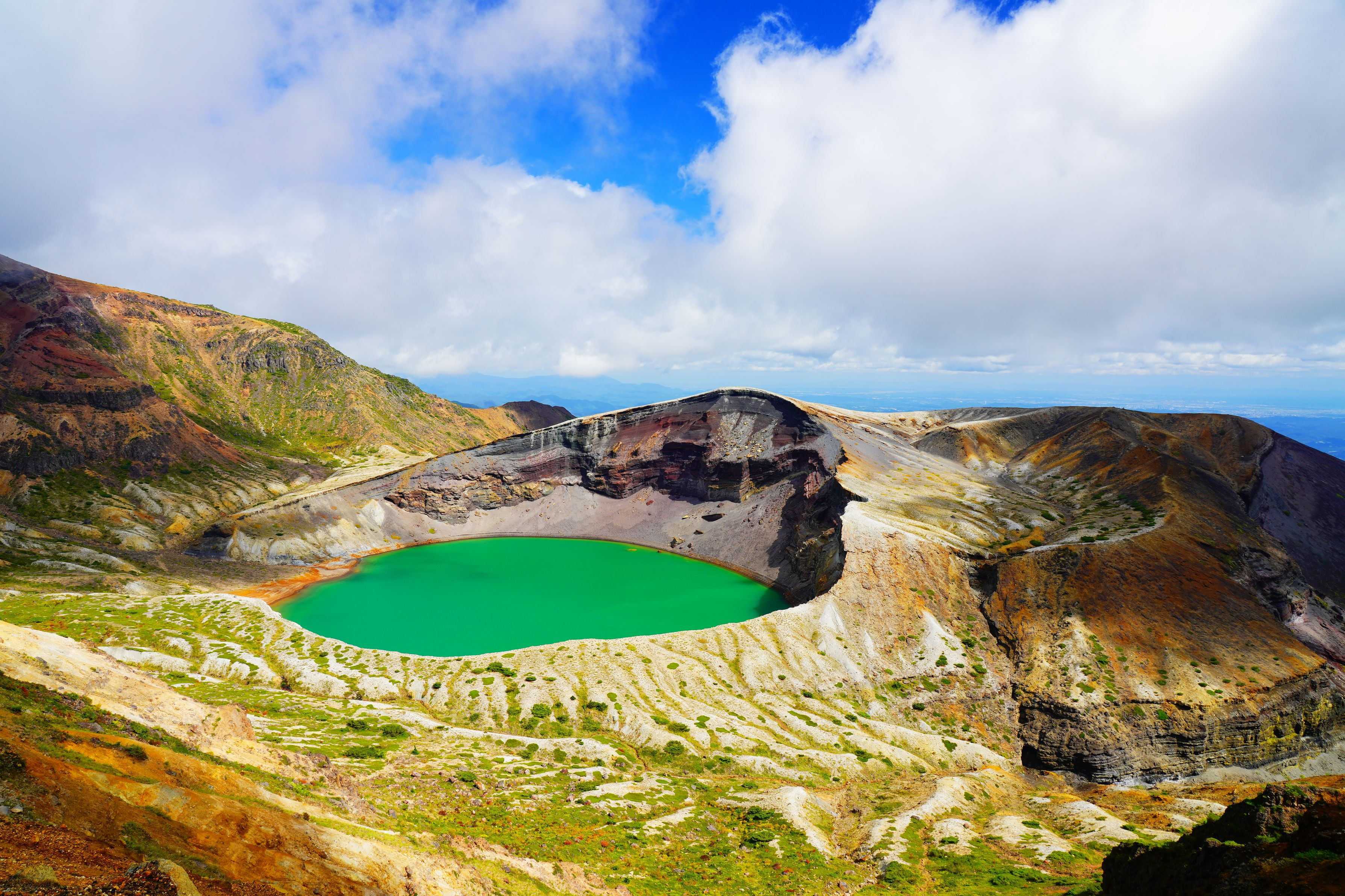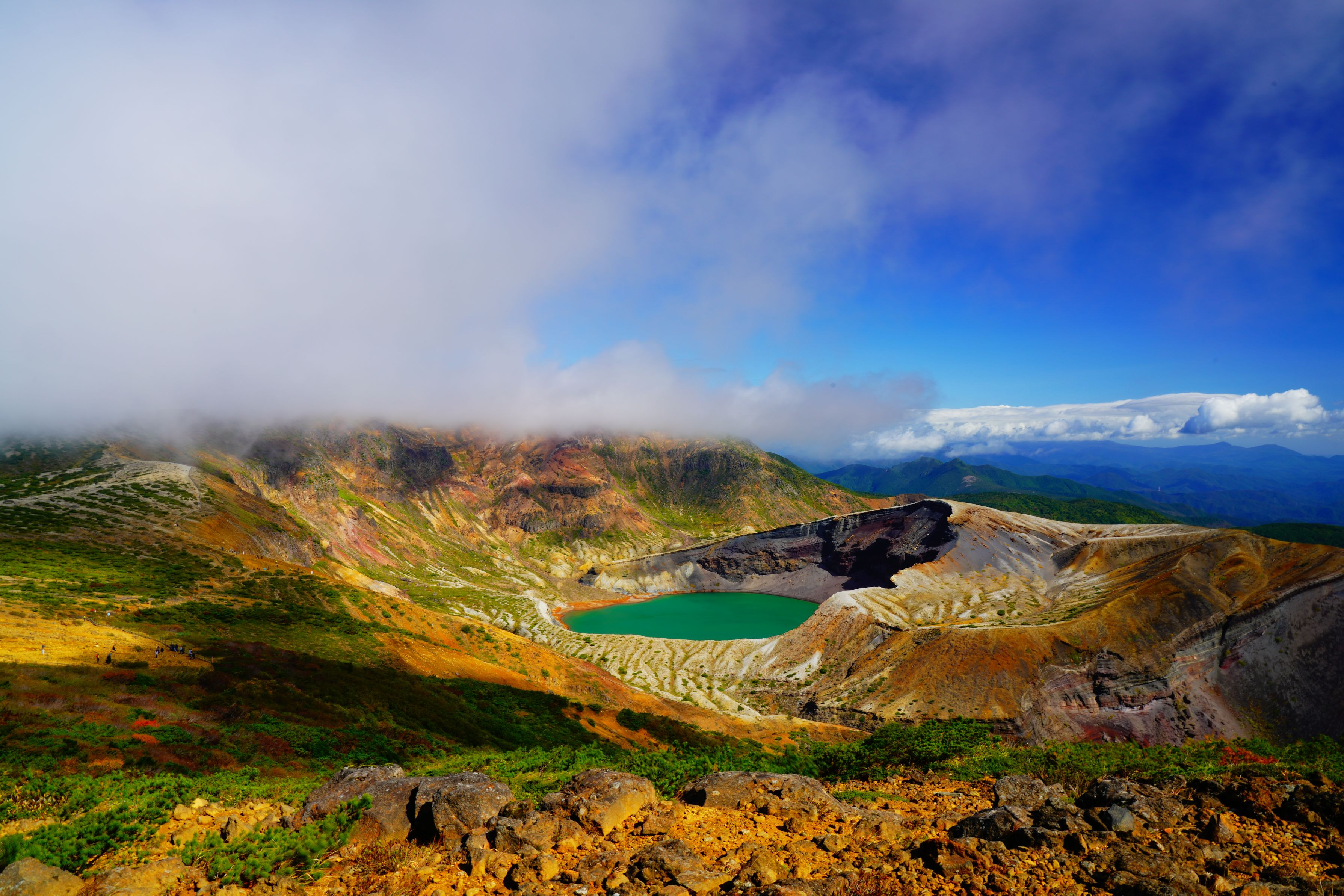 風強く気温14℃と寒かったです、雲がみるみる流れお釜に日が差すタイミングを狙いながらの撮影でした。