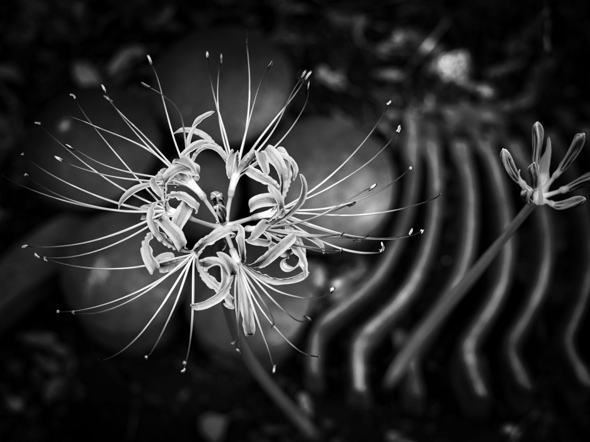 彼岸花,花茎の先に5~8個の花が集まり、細長い花びらとそこから伸びるしべ 彼岸花の学名である「radiata」ラテン語の「放射状」