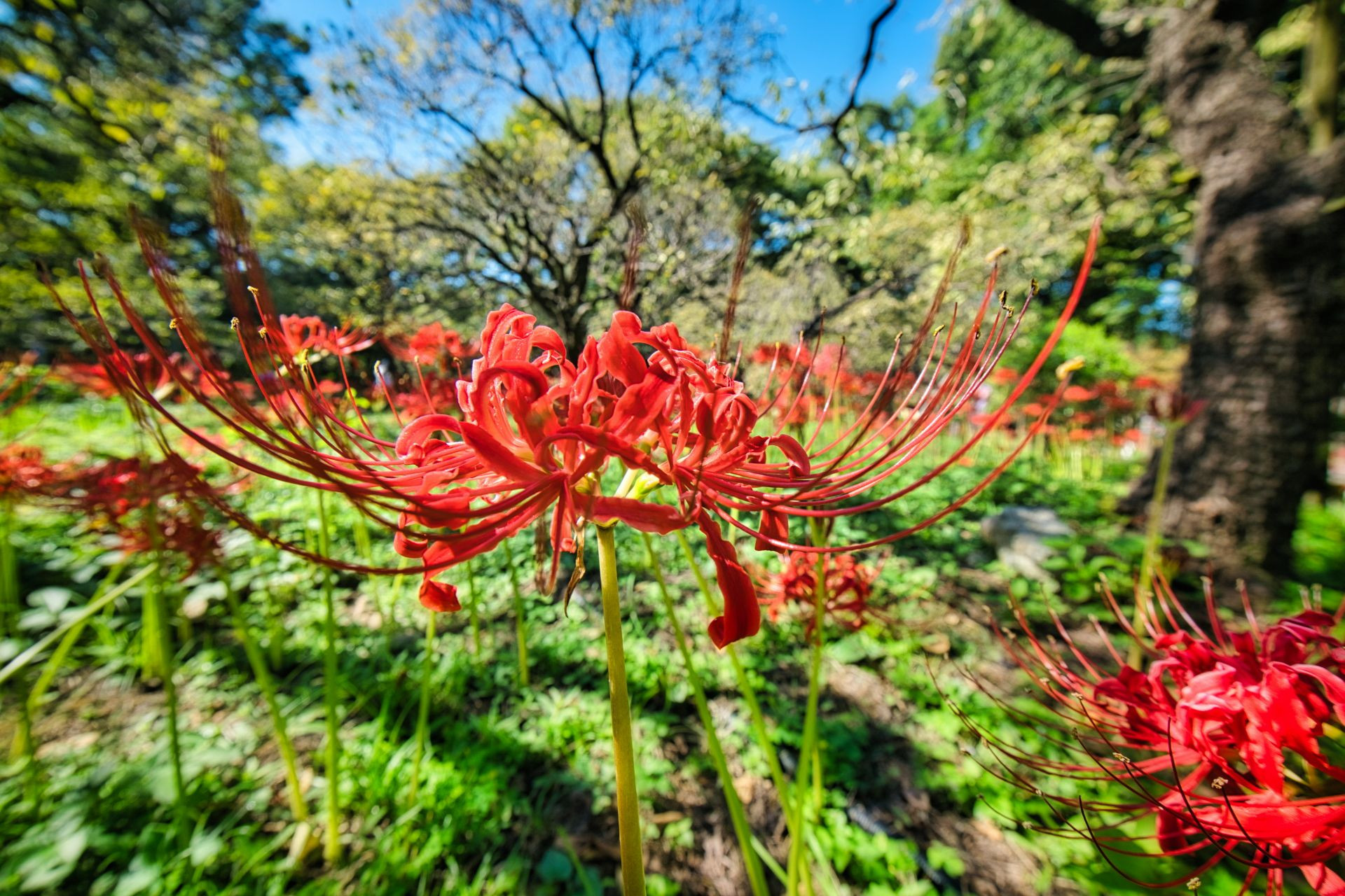 彼岸花,花茎の先に5~8個の花が集まり、細長い花びらと そこから空に向かって伸びるしべ! 広角でぐっと近づいてパチリ! #東京都#
