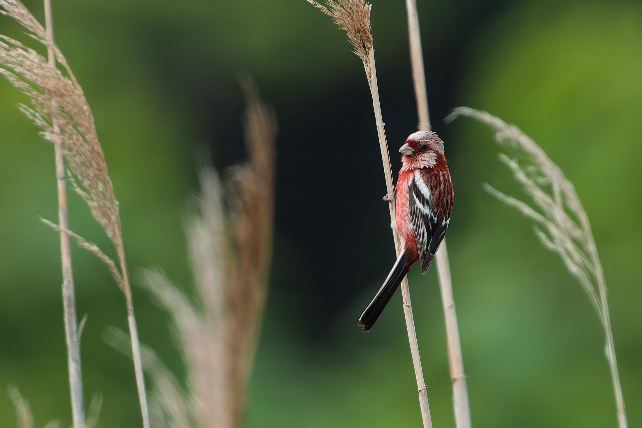 初夏のオムサロ湿原、久しぶりに綺麗な夏羽の#ベニマシコ#さんを撮影できたのですが、なんとなく秋っぽい仕上がりになりました…