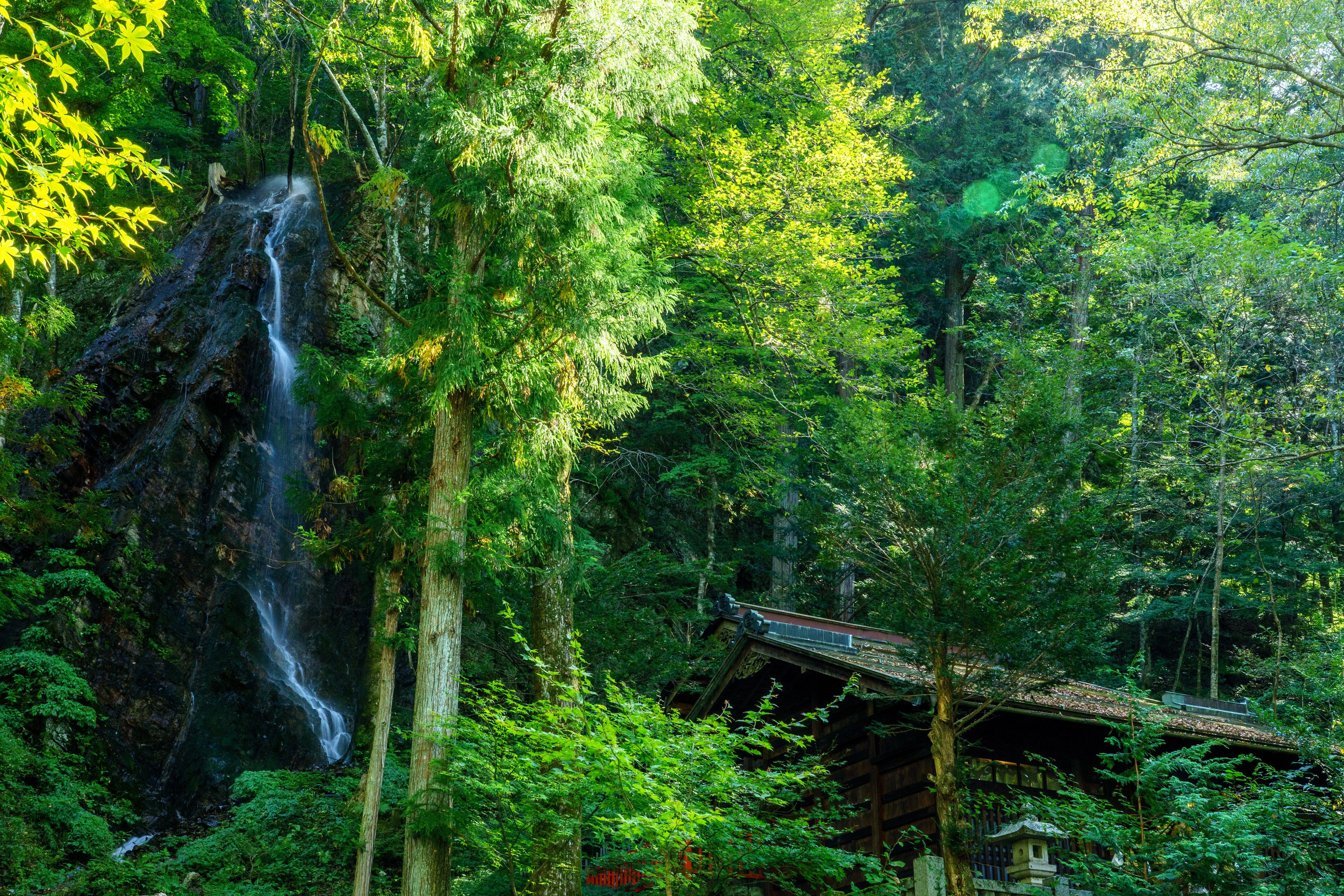 神社の本殿裏の岩壁を流れ落ちる滝 #長野県# 撮影地:長野県木曽郡木曽町南宮神社