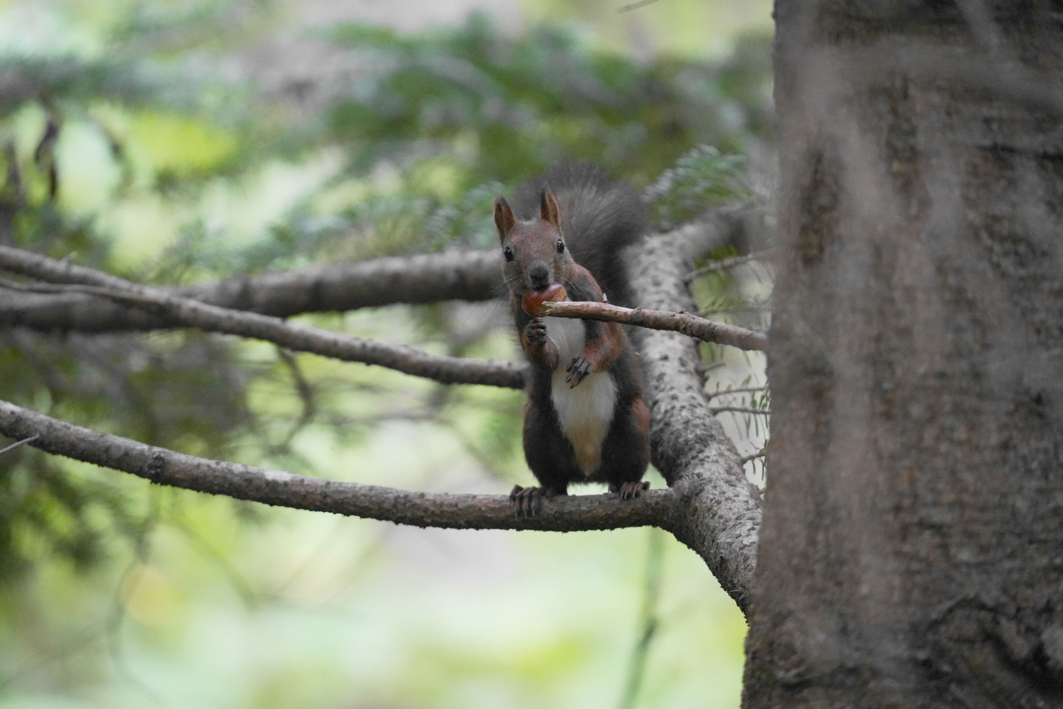 栗をくわえたエゾリス君。これから秋の味覚を満喫するのでしょうか? グルメですね。