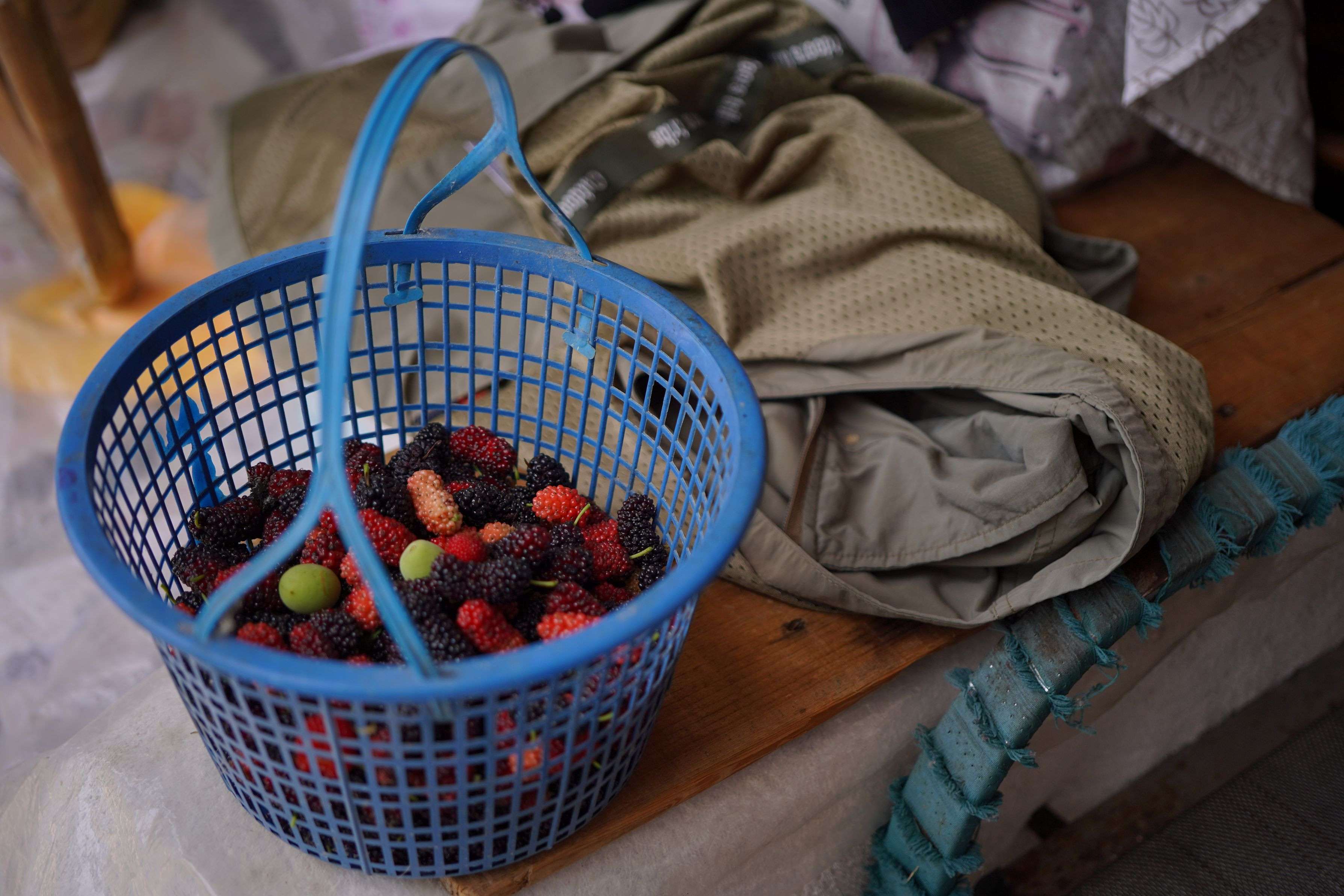 ゴールデンウィークに田舎で桑の実狩りをやりました。 EV値をやや低めで、田舎午後静かの時間を表現したいと思います。 赤と青など色の対比が気に入って、静物画みたいの構図にしました。