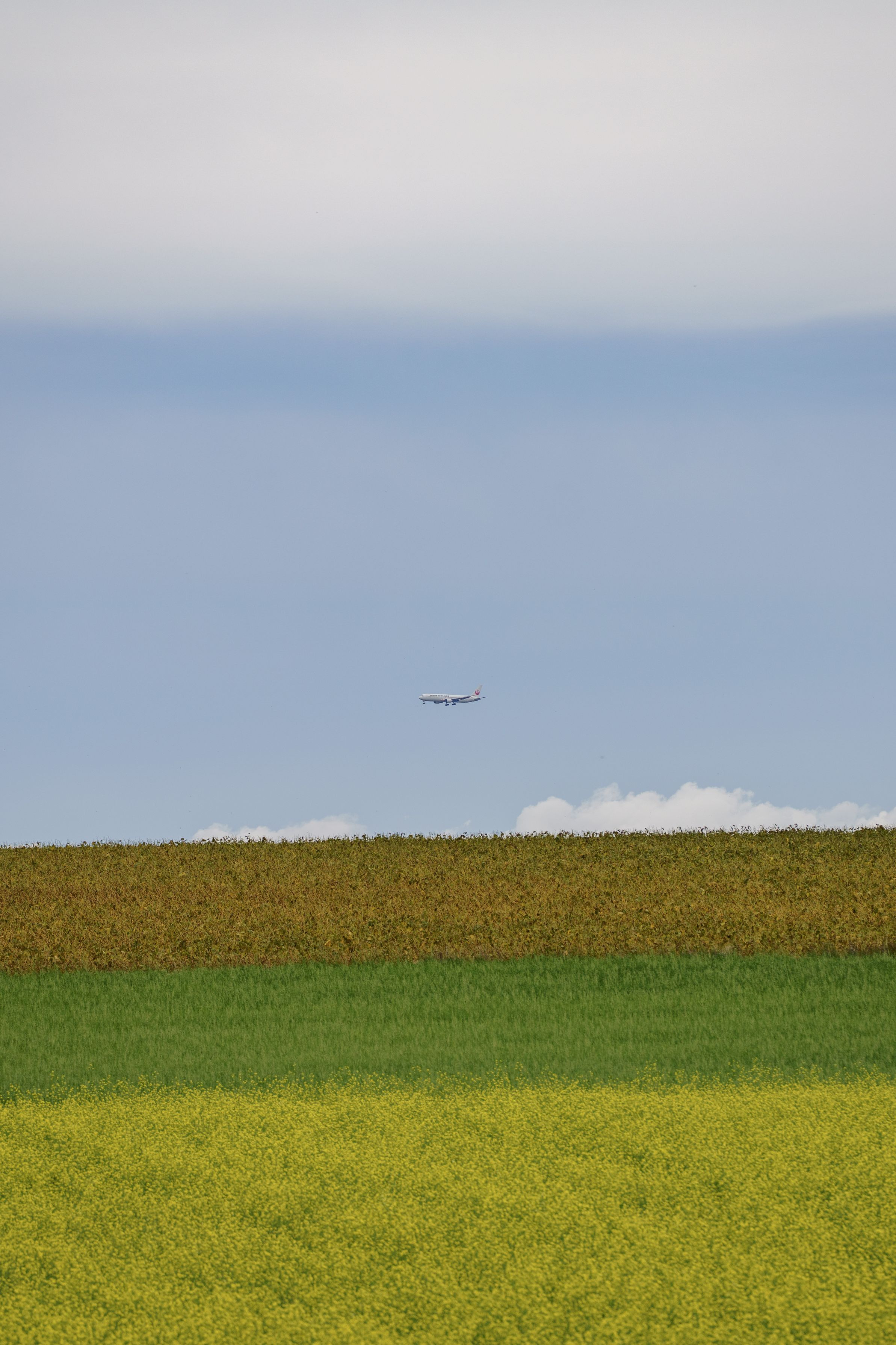 美瑛の丘の先をゆく飛行機を望遠で。 ちょうど5色サンドイッチの中を飛行機が飛んでいるような風景になりました。