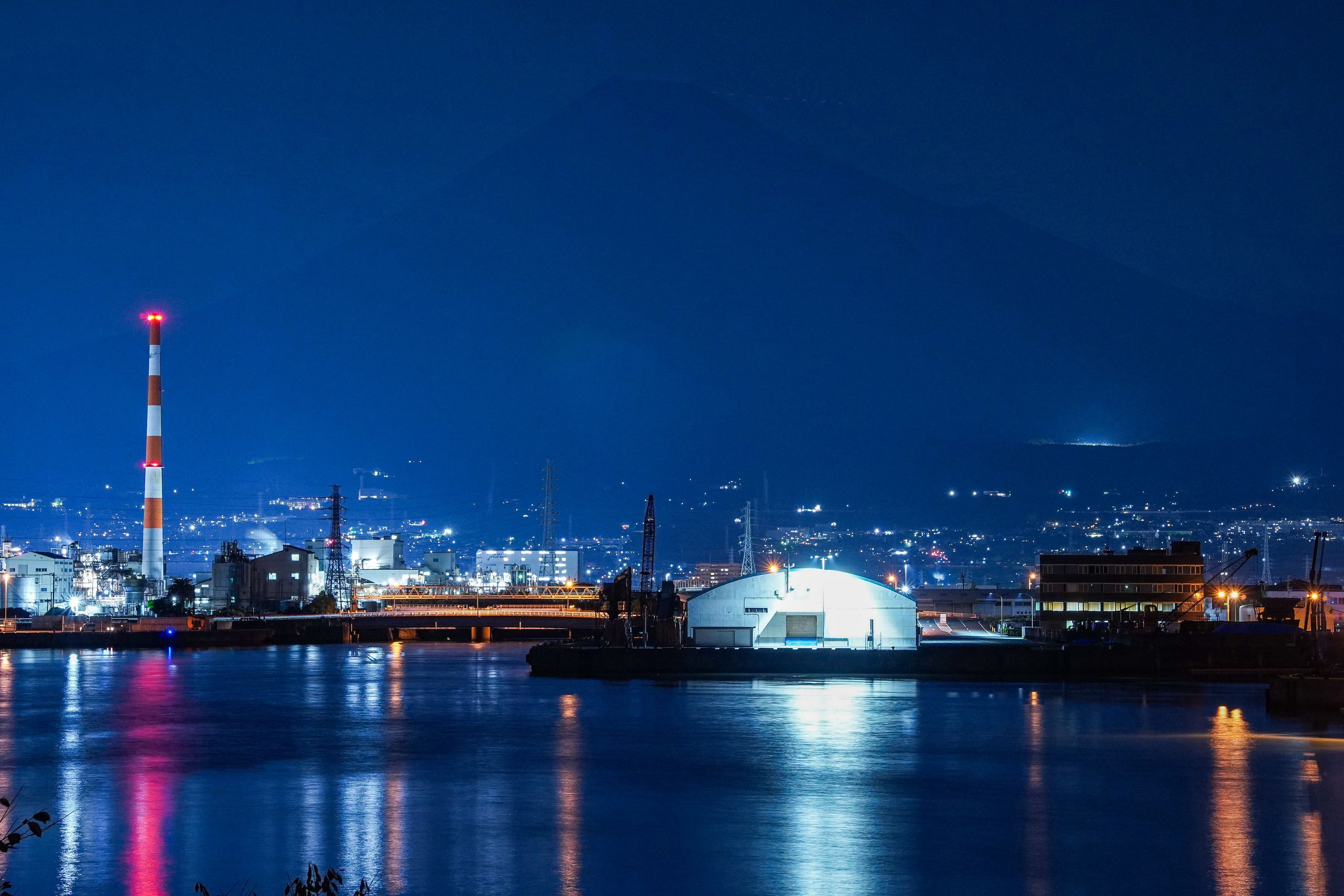 富士山を撮りに行ったら、曇っていたためかシルエットしか見えず…工場夜景と一緒に。