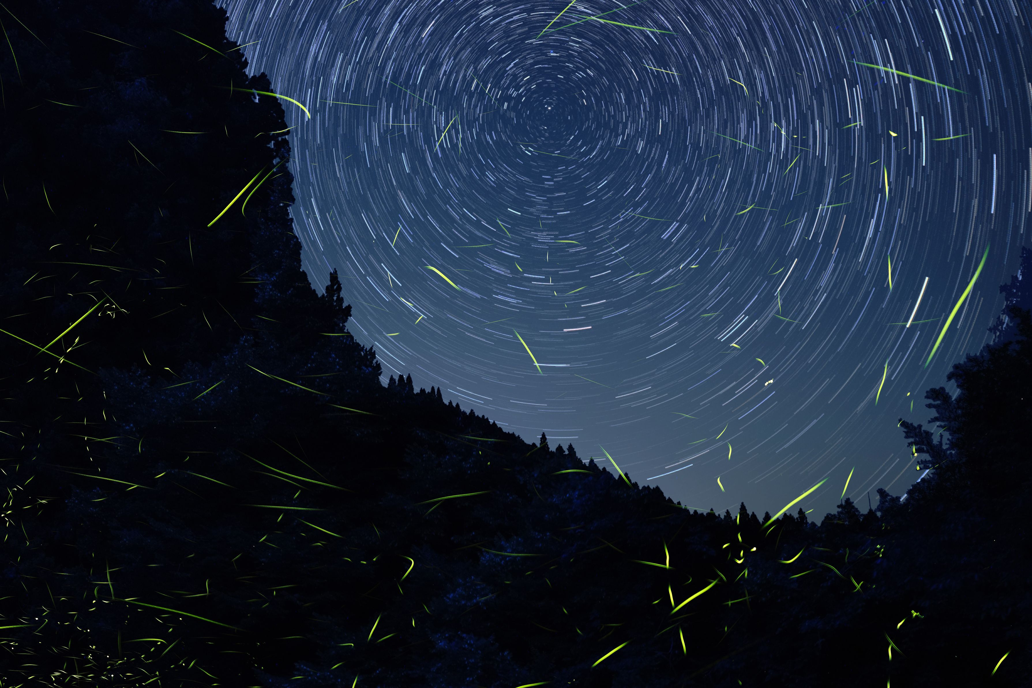 蛍の飛翔を長時間露光していると背後に周回する星が映り込んだ