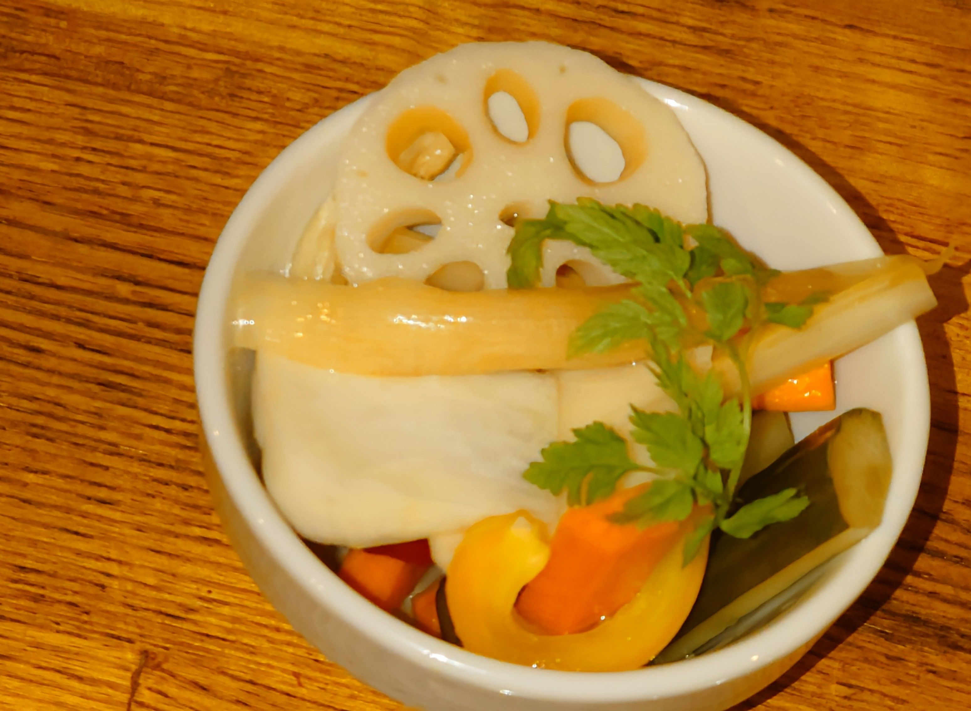 蓮根、黄色と赤のパプリカ、セロリ、キュウリ、人参、ミョウガの彩りあるお野菜ピクルスです🙂 チャービルを添えて🍀