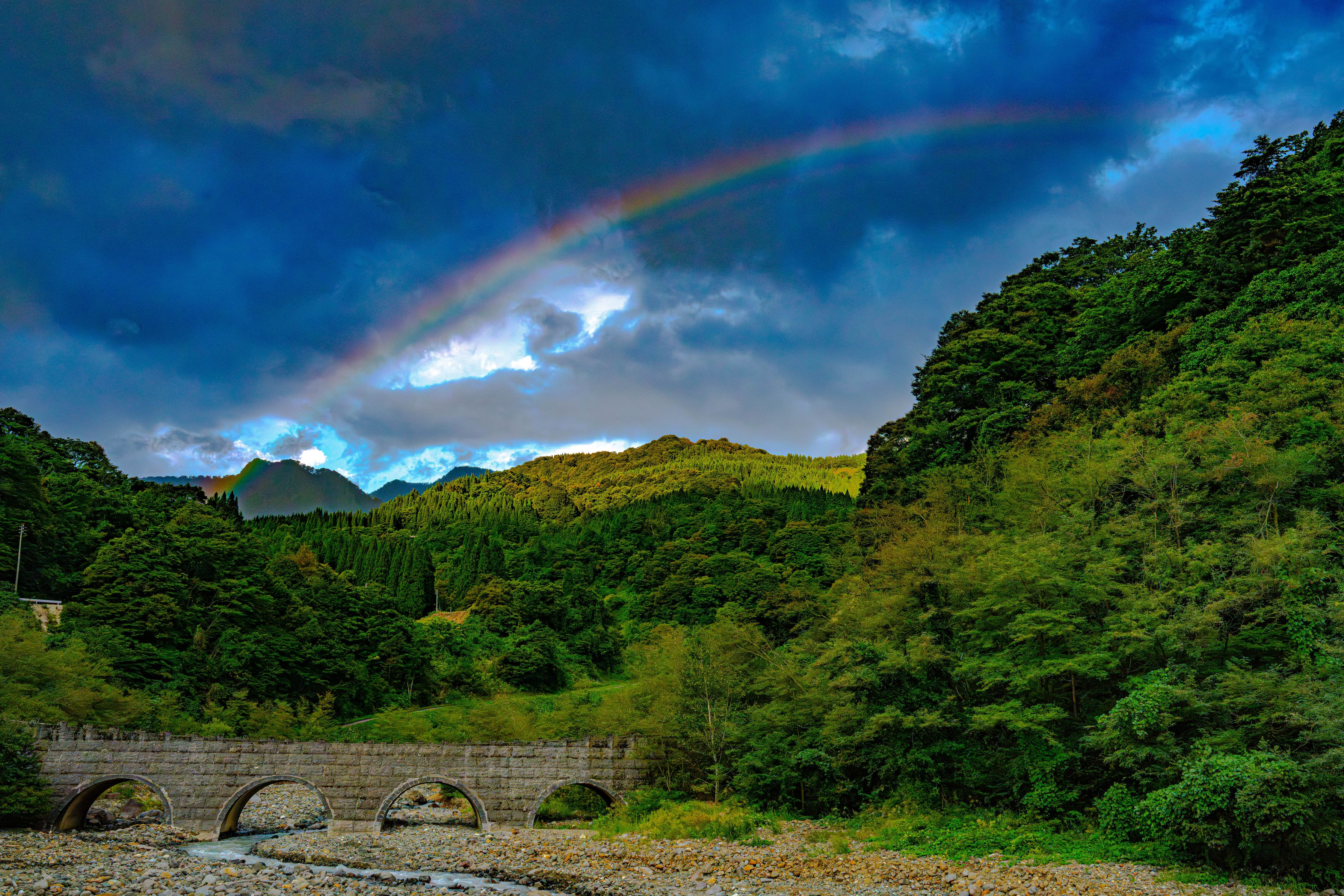 長野県小谷村にある「浦川スーパー暗渠砂防えん堤」 日本三大崩れのひとつ 稗田山(ひえだやま)の大崩壊地を有する浦川は、日本でも屈指の荒廃渓流 そこに建設されたこの砂防えん堤は 一見、古代ローマの橋の様でもあるが 虹が出たことによってRPGのワンシーンのような世界を現出させた