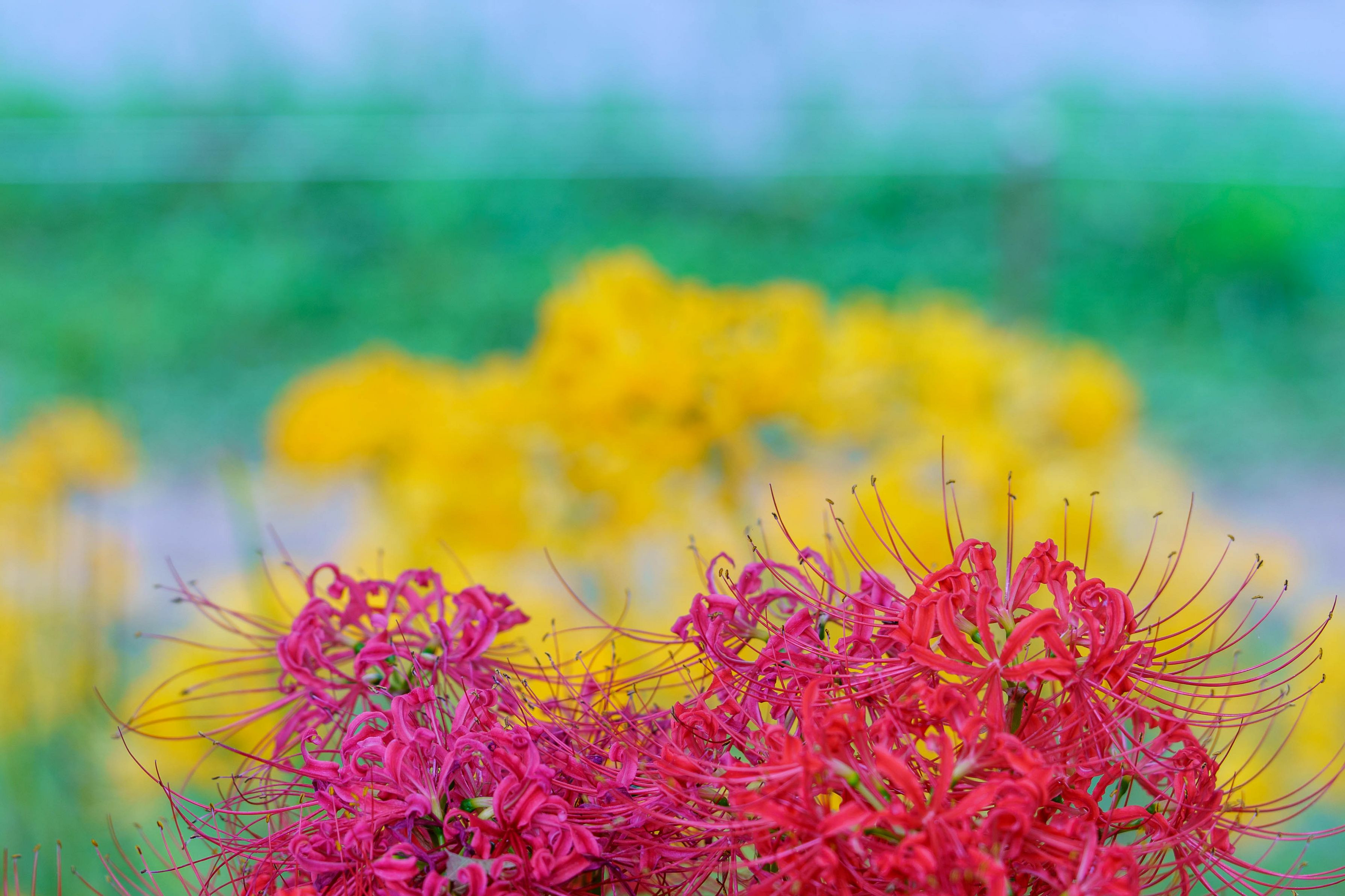 赤、黄をはじめピンク、白の彼岸花が咲き誇っています。高浜市 稗田川。