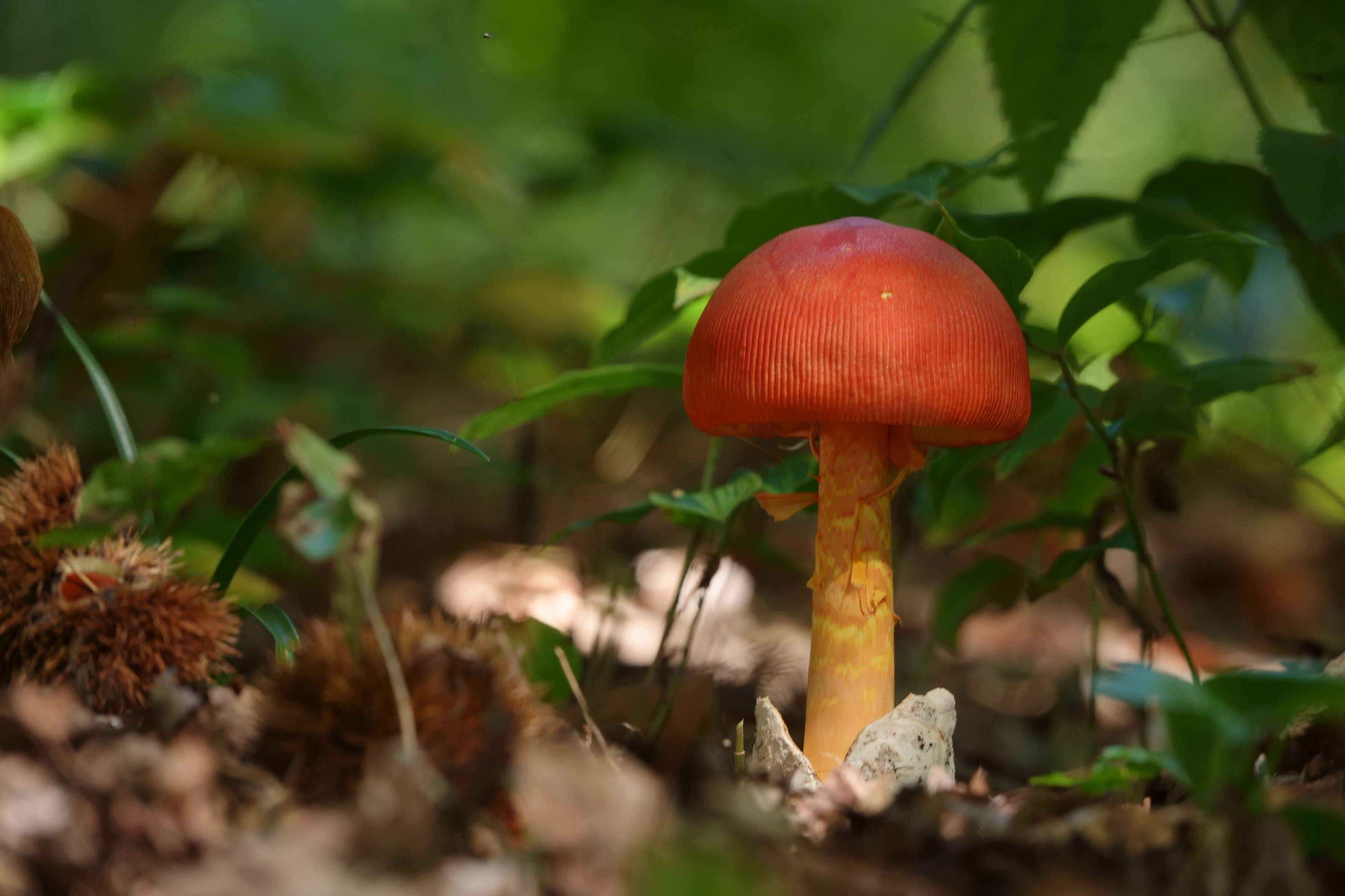 タマゴタケと山栗です。 今年は雨が少なかったからか、キノコの出が遅いようです。 例年ですと、9月の初めごろから見られるのですが、今年はやっと、見つけました。 タマゴタケは食用になり、美味しいそうです。 私は、食べたことありませんが。