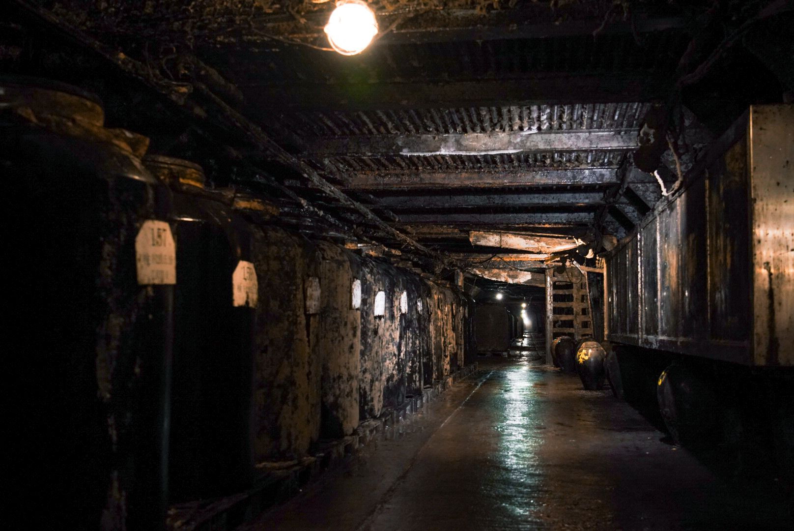 トロッコツアーがあるということで薩摩金山蔵へ。 坑道内は涼しく所々水が滴り落ちるところも。写真の釜で焼酎を貯蔵・熟成させるそうです。この錆びれた空間と雰囲気がこれまでの歴史を彷彿とさせます。 かつては金山として栄えた面影も感じつつ、焼酎作りの現場を実際に見る貴重な体験になりました。この坑道、120kmに及ぶそうです…。