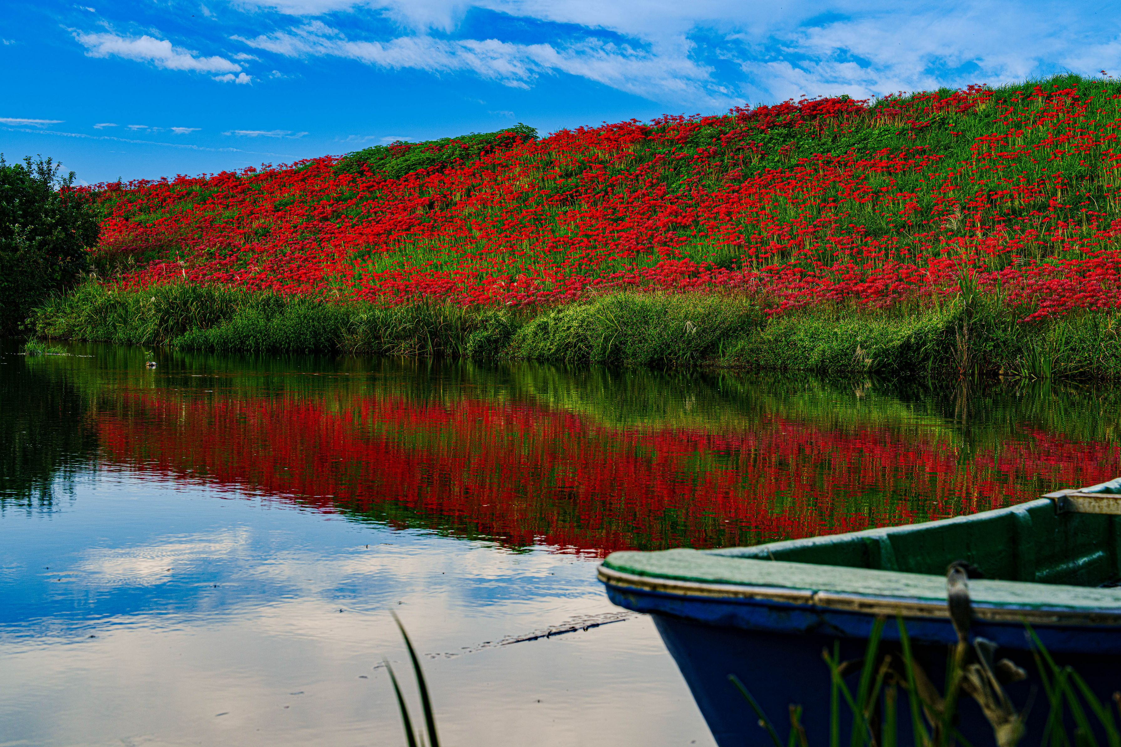 -海津市 津屋川堤防- 養老山を源泉とする揖斐川の支流津屋川、海津市南濃町津屋辺りの堤防には、おおよそ3キロメートルにわたり10万本もの彼岸花が群生し、川面にも映り込む美しい光景とともに訪れる人の心を魅了していました。
