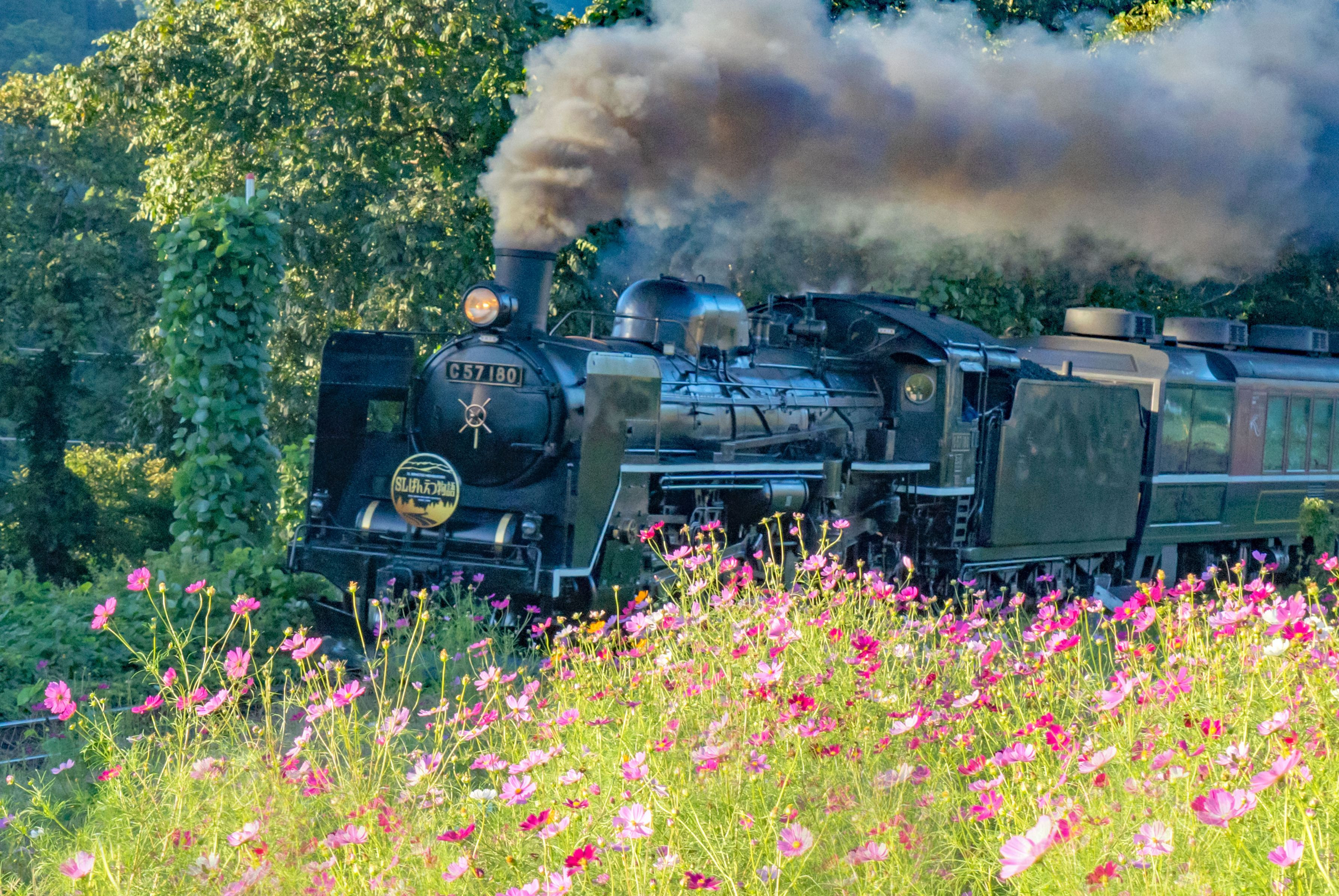 猛暑がようやく落ち着いた初秋の日。線路沿いのコスモス畑の傍らを汽車が往きます。乗客の皆さんの眼も楽しませたことでしょう。