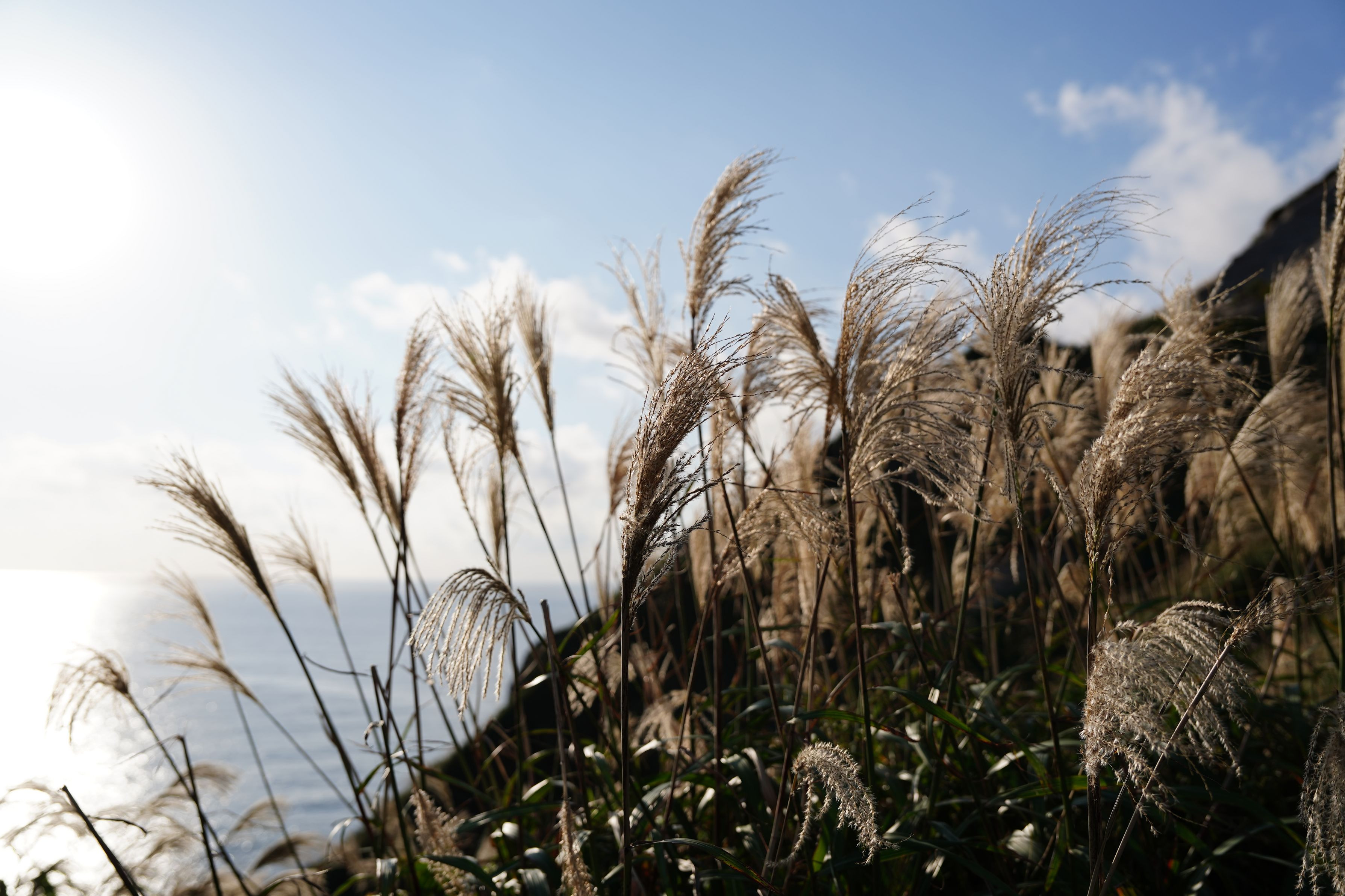 念願の北海道ドライブ旅行、積丹半島の神威岬にて。まだ暖かさは残るものの、景色はすっかり秋でした。ススキは順光でも逆光でもいいですね。