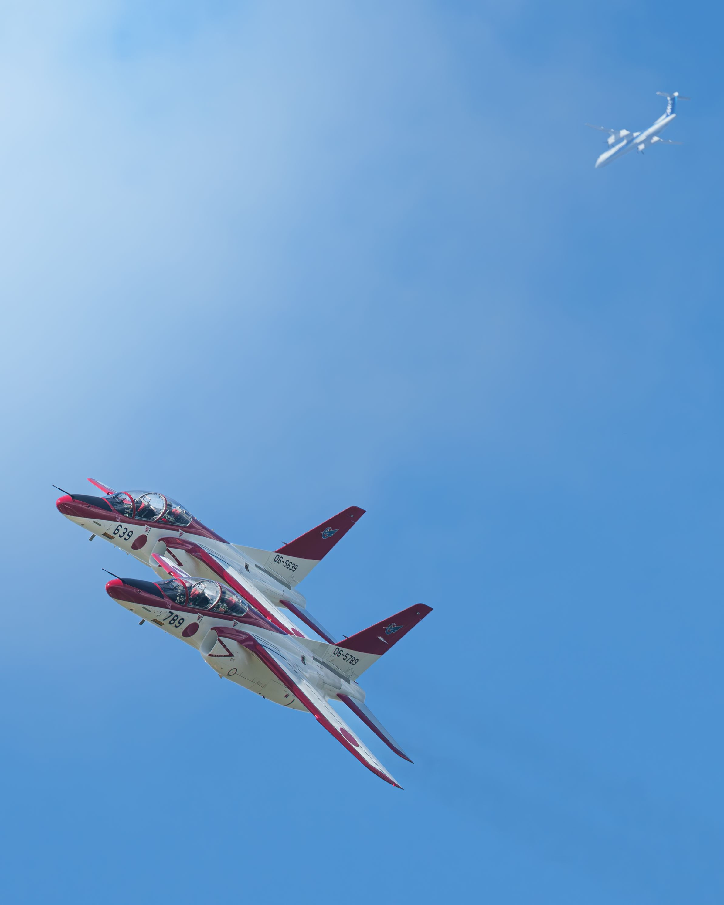芦屋基地航空祭での一枚 遥か高い空のANA機とレッドドルフィンが一枚に収まった写真