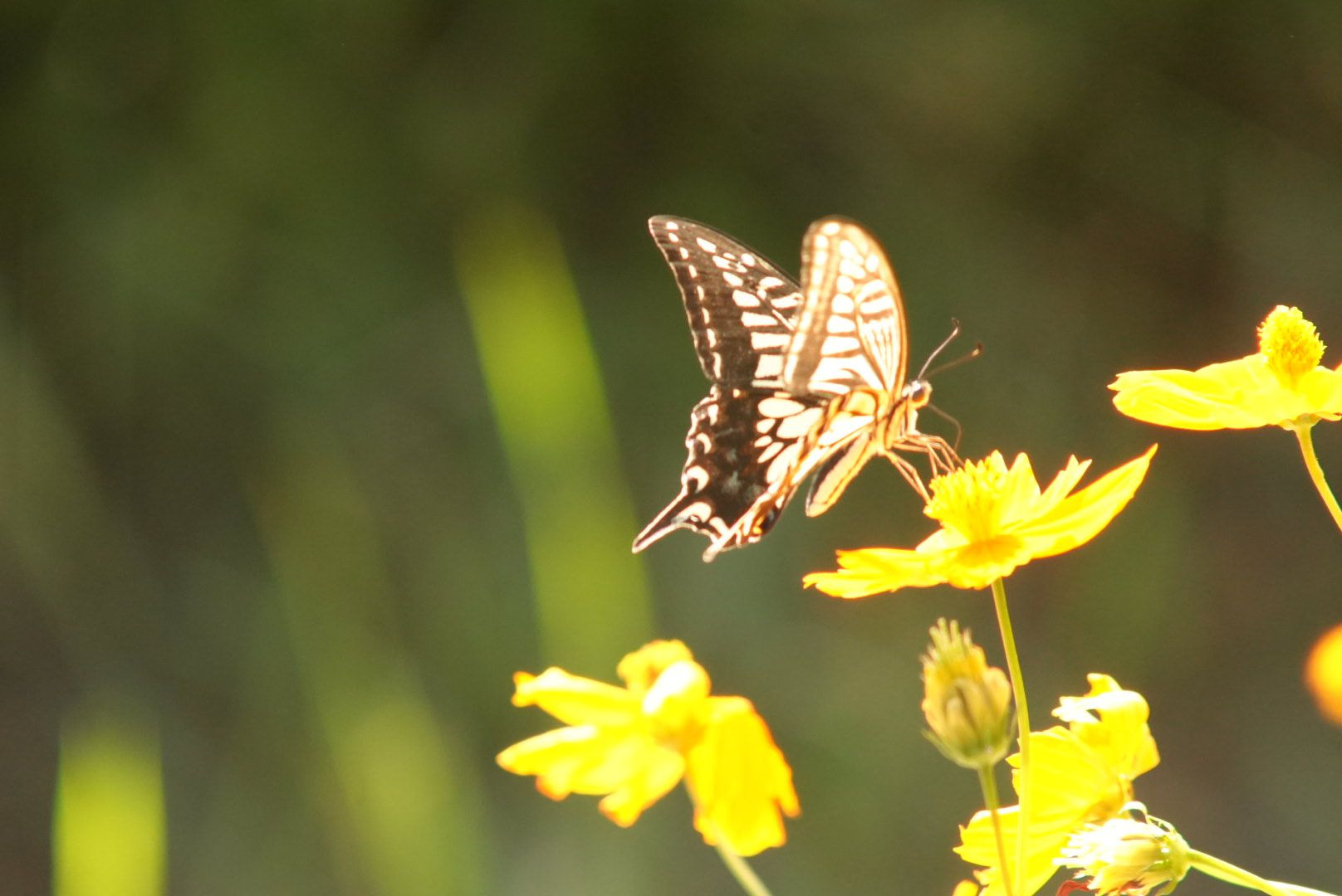 キバナコスモスにナミアゲハがとまっていました。光りで羽根が光ってきれいです。10月中旬でも元気に飛び回っています。 450mm F8 でマニュアル撮影しました。