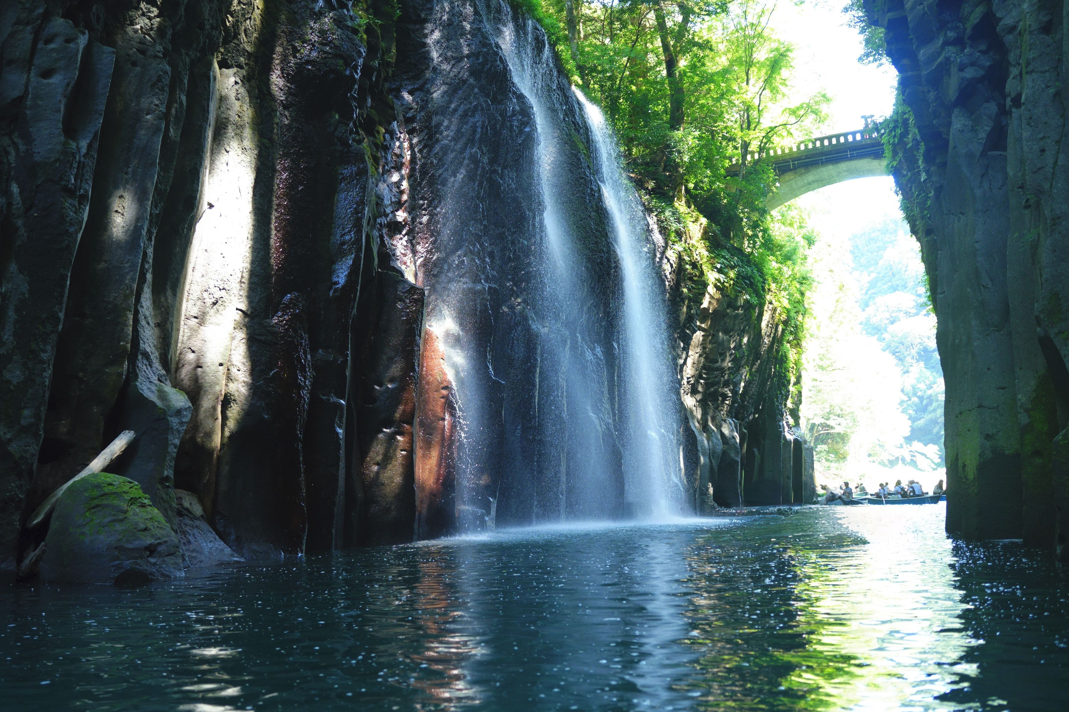 2025/7に訪れた宮崎県高千穂峡真名井の滝をボートから撮った一枚。 間近に見る滝は想像以上に大きく、迫力があり橋の上から見る景色と全然違いました。 滝の飛沫の鮮明さなど体験したそのまんまを写真に収めることができました。 ※写真の中央あたりにボートがひしめき合っていたため、編集ソフトにて消去しております。