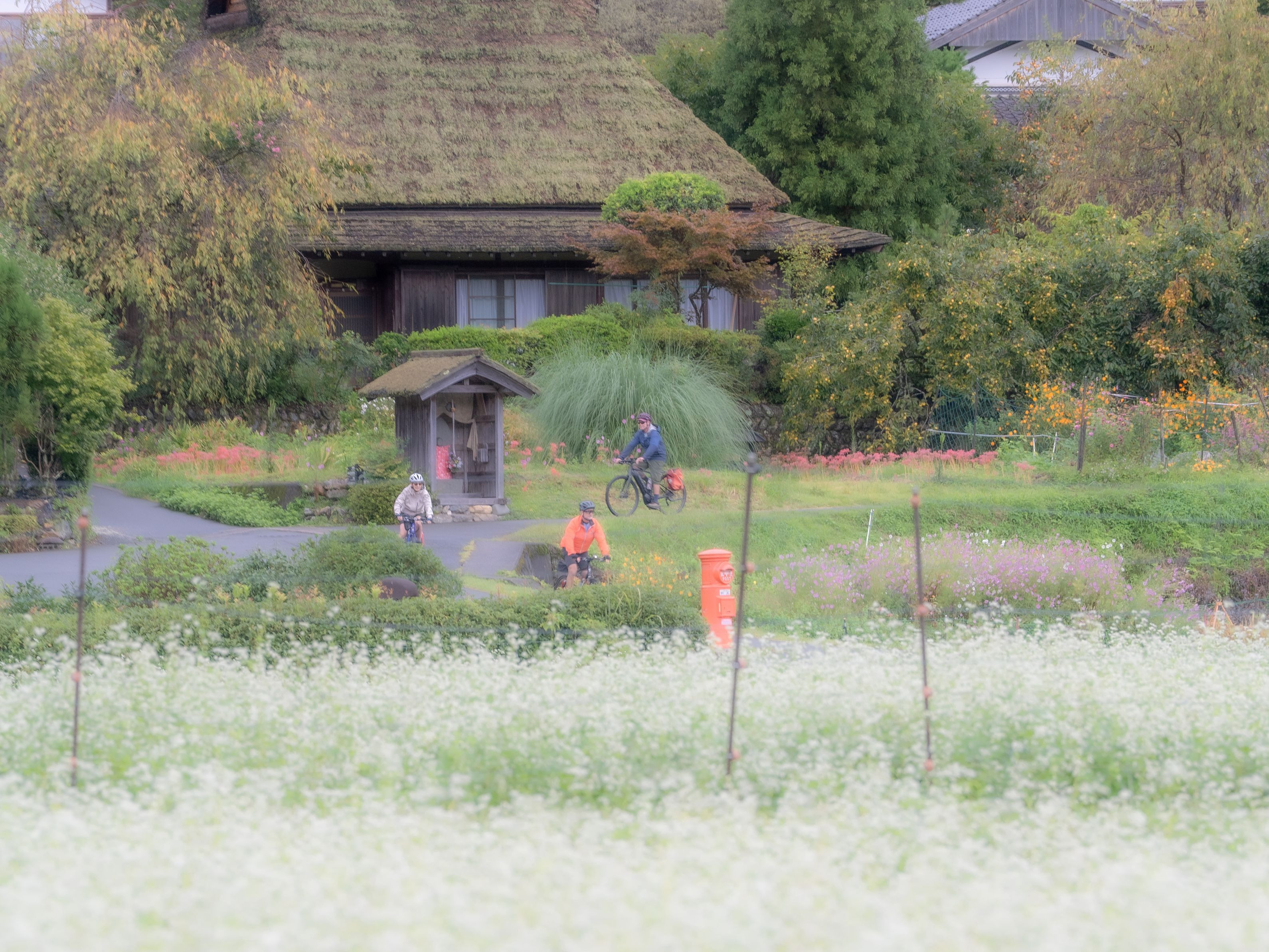 茅葺の里のまわり ふわふわ一面の蕎麦畑 颯爽と走るロードツアラーと