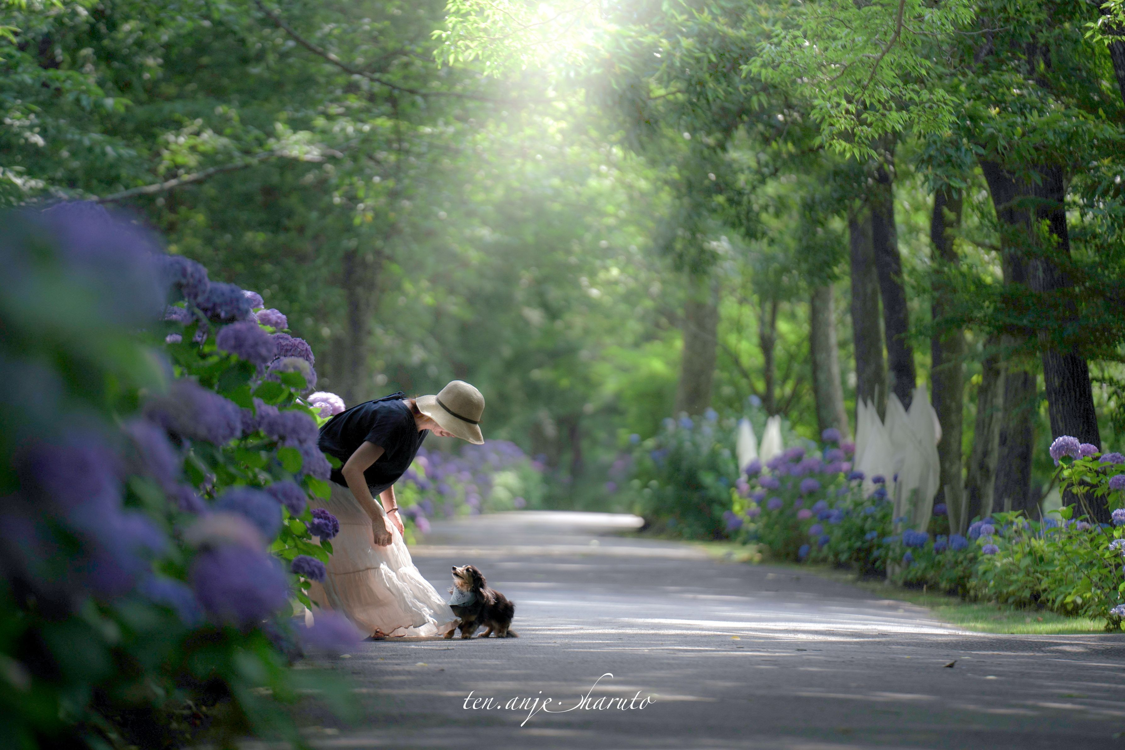 紫陽花の小路で愛犬とアイコンタクトを取って おしゃべり中です𓂃 ◌𓈒𓋪 内容は内緒🙊