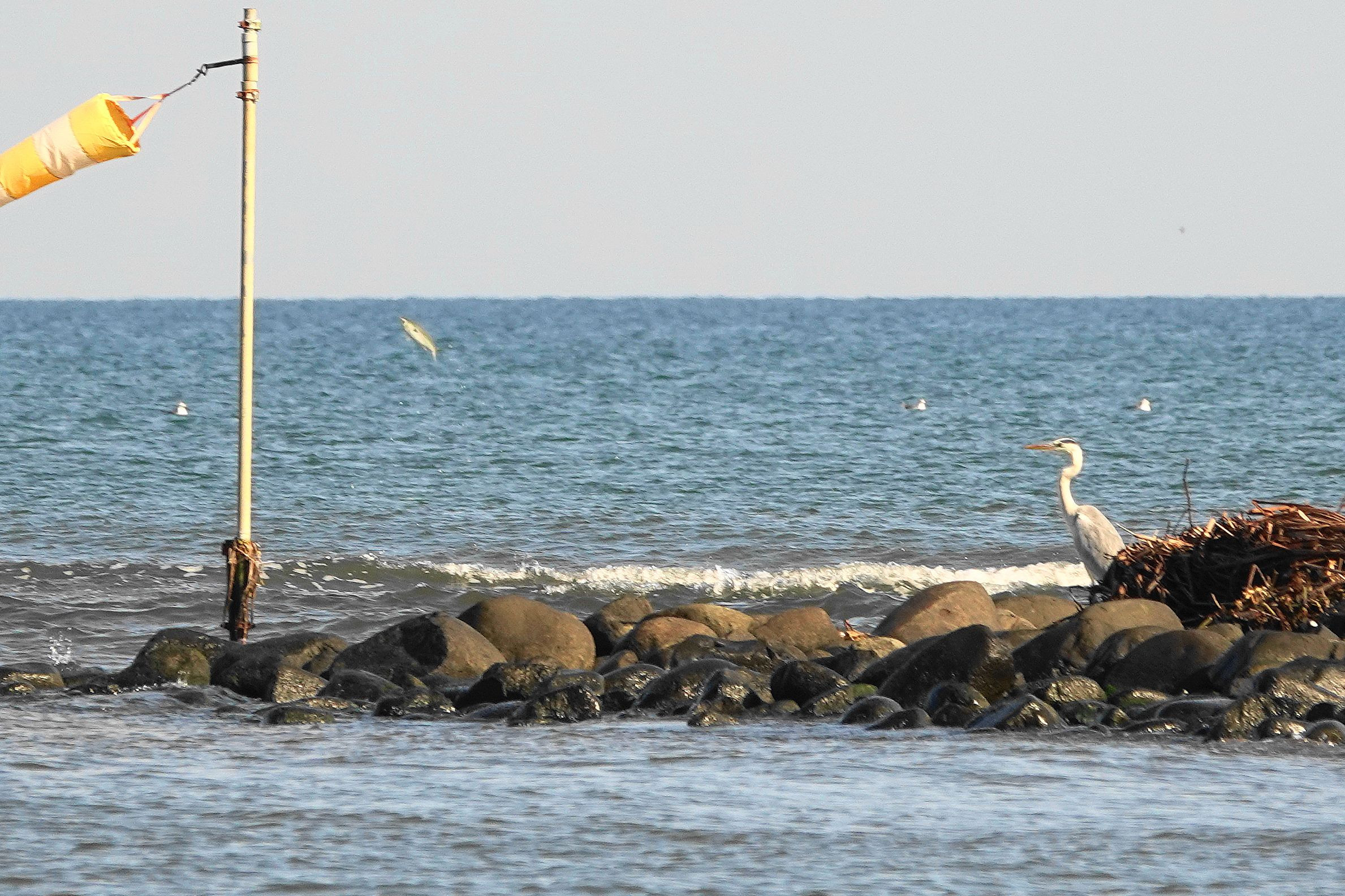 河口近くでボラがたくさん飛んでいたそれをサギやカモメが見ていました。