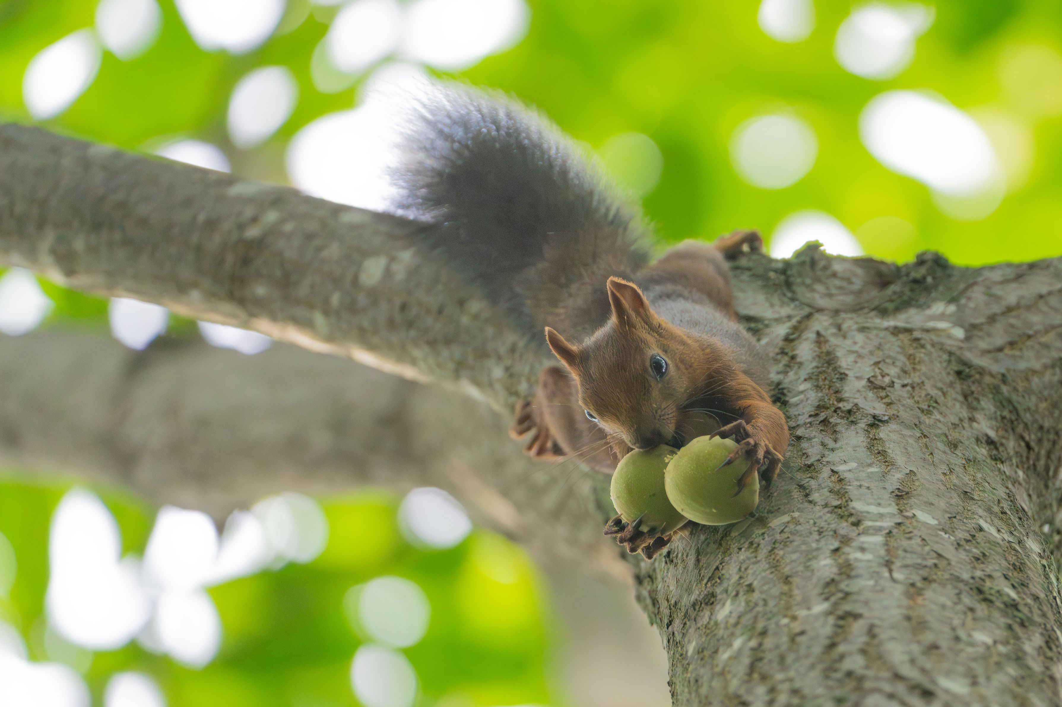 高い木の上から胡桃の実を取り、地面まで運ぶエゾリス🐿️この直前、1個落としちゃいました🥹下まで運んだ後は冬に備えて土に埋めます。