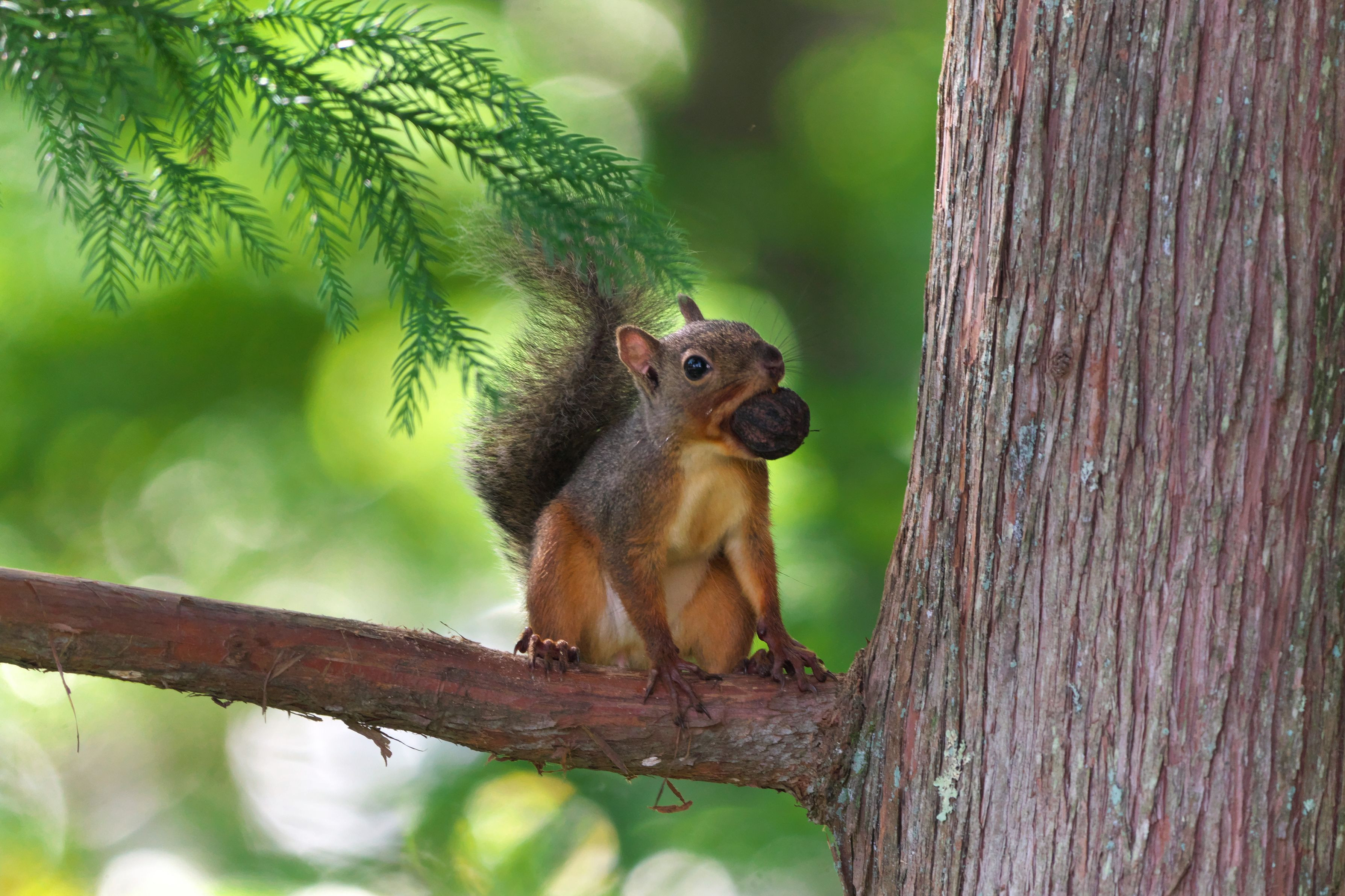 近所の森を散策すると、カリカリと一所懸命にクルミを齧る愛らしいリスの姿がありました。